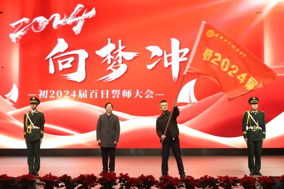校武术队的《甲辰龙腾•附中圆梦》拉开了誓师大会的序幕。接着邓晓鹏总督学把象征着使命和期望的年级旗帜授予了初2024届分管领导刘建勇。各班班主任为班级授予班旗,接力“使命”与“奋进”的红色旗帜飘扬在整个会场,同学们将熔铸“不破楼兰终不还”的信念之梦、“追风赶月不停留”的拼搏之梦,将奋斗写进春天里,将坚毅写进青春里。