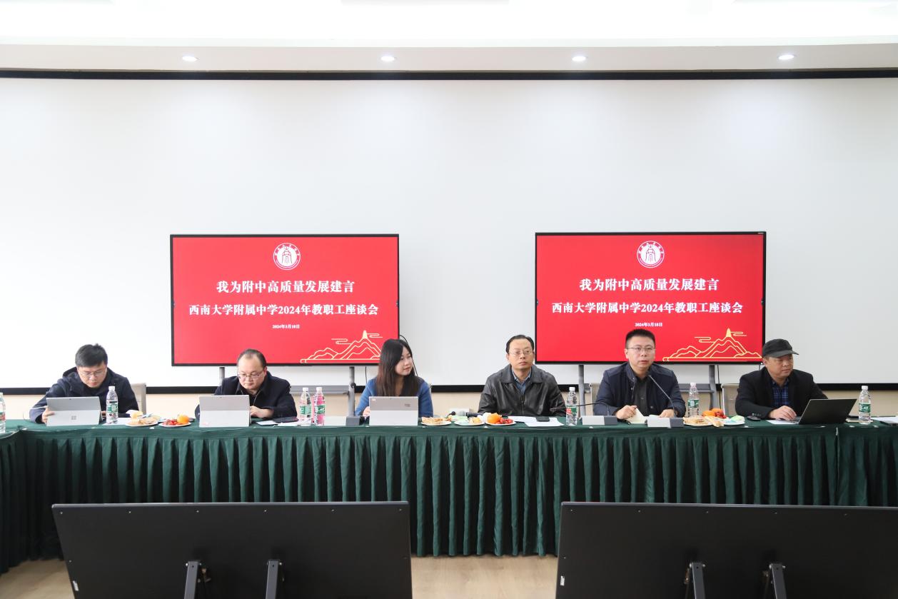 为加进一步提升学校办学质量和水平,3月18日下午,PA视讯附属中学召开了“我为附中高质量发展建言”2024年度教职工座谈会。校党委书记欧健,校长、党委副书记张勇,副校长梁学友、彭红军、徐川出席会议,学校各部门干部及各校区、各教研组、民主党派教师代表参加会议。会议由校党委副书记、纪委书记刘汭雪主持。