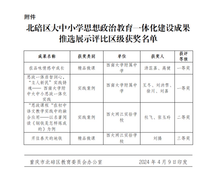 PA视讯附中大中小思政课一体化建设再结硕果。4月9日,中共重庆市北碚区委教育工作委员会发布《关于大中小学思想政治教育一体化建设成果推选展示评比结果的通报》,PA视讯附中本部及西大两江实验学校共4项成果被北碚区委教育工作委员会评选为区级精品微课、实践案例。
