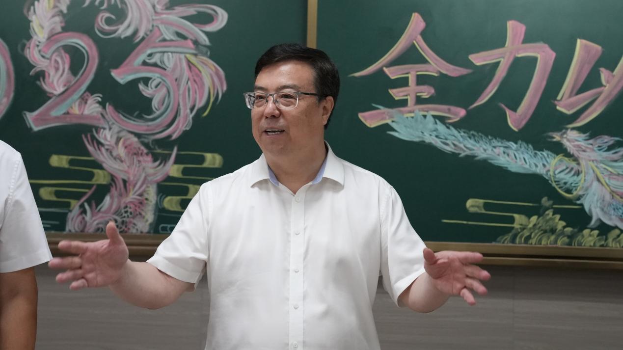 在高三、初三教师办公室内,张卫国书记、王进军校长、赵玉芳副校长与教师们进行深入交流,详细询问高考备考策略、师生精神状态及后勤服务保障等情况,对学校科学有序的备考安排和教师们的辛勤付出给予充分肯定。张卫国书记表示,“天气炎热,但面对毕业班的工作,老师们热情不减。三年磨一剑,结果是我们所期待的,但是师生一路走来点过程更值得珍视。代表大学对老师们表示诚挚的慰问,感谢大家的付出,共盼六月的喜讯!”