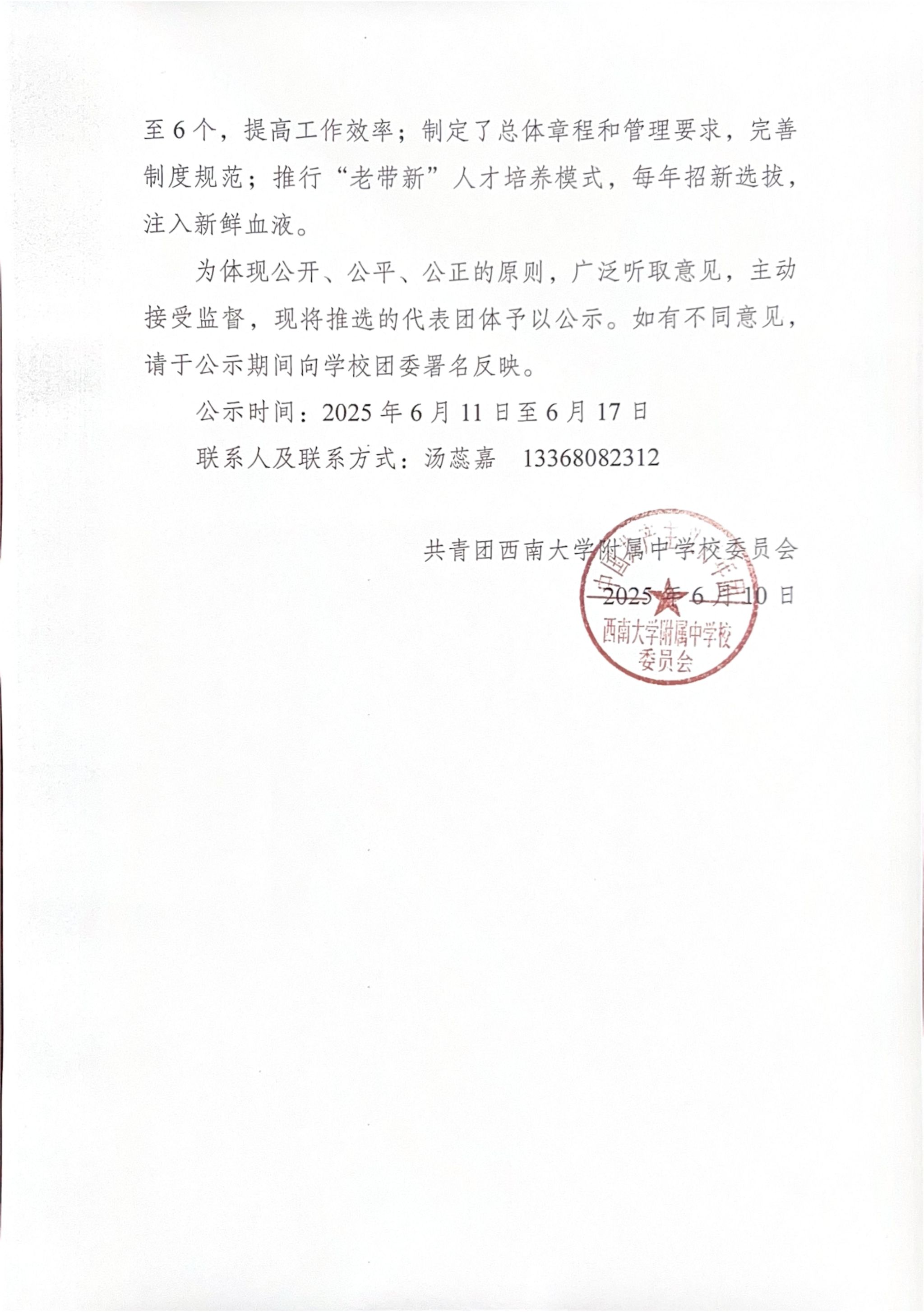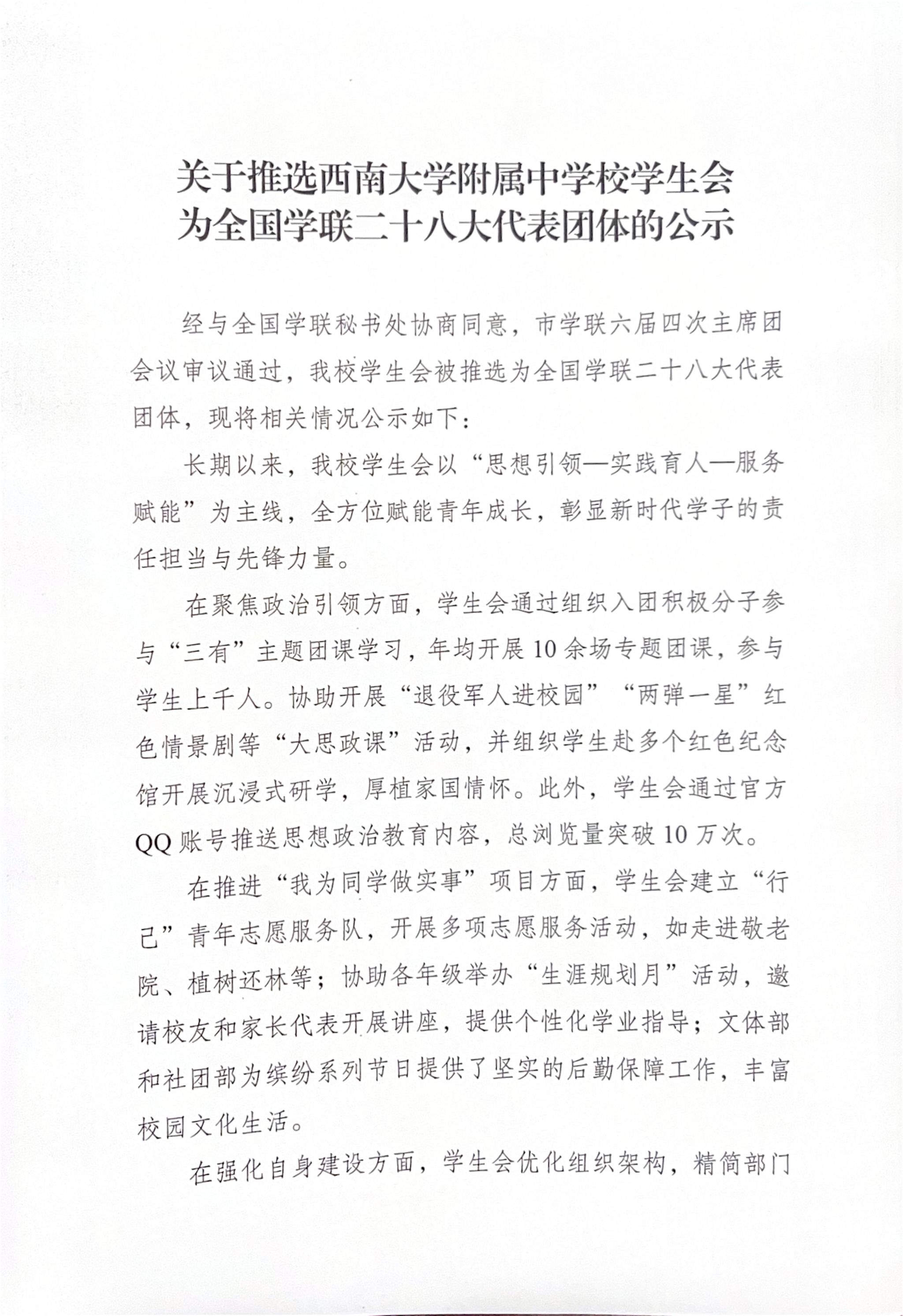 关于推选PA视讯附属中学校学生会为全国学联二十八大代表团体的公示