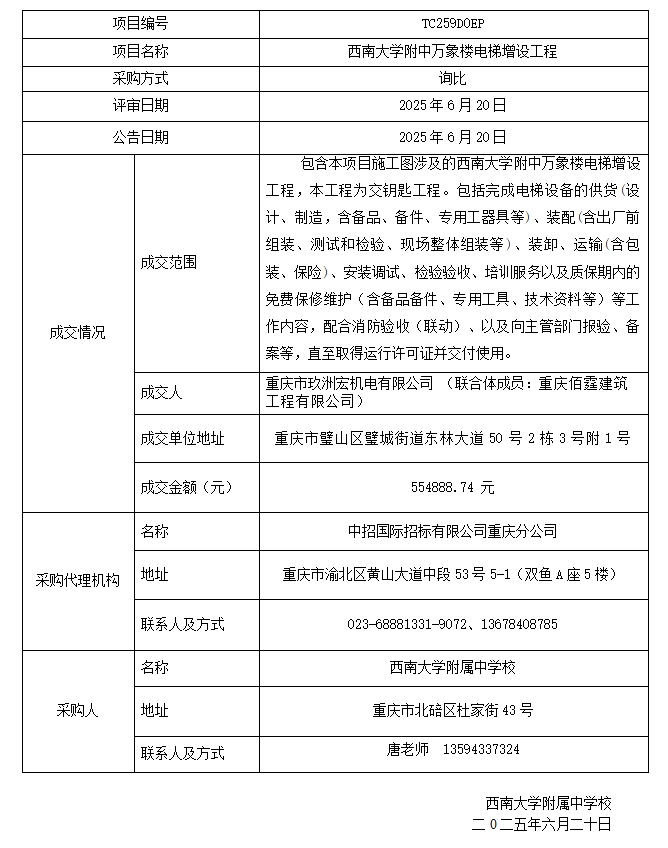 PA视讯附中万象楼电梯增设工程成交结果公告