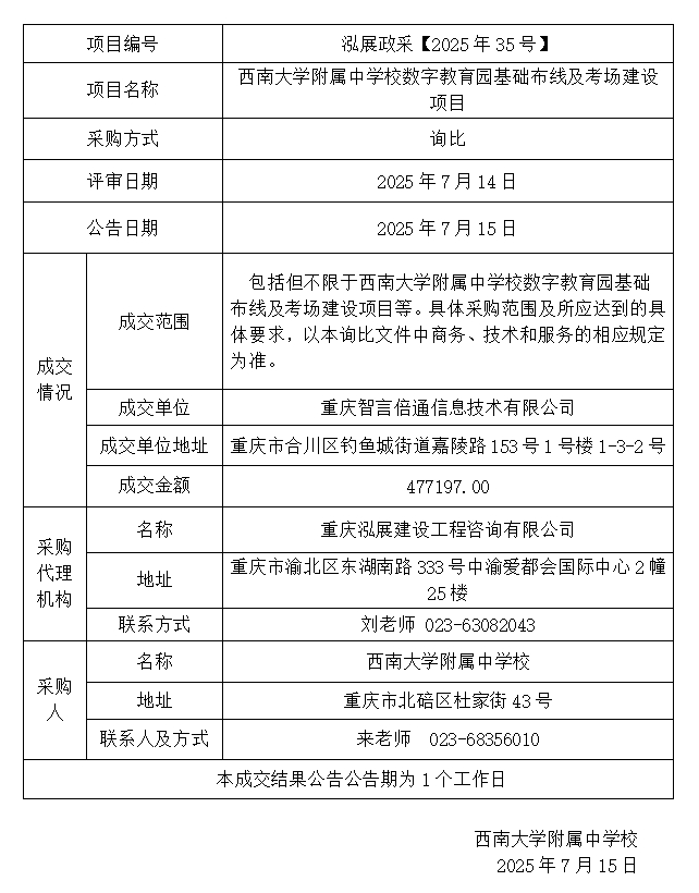 PA视讯附属中学校数字教育园基础布线及考场建设项目成交结果公告