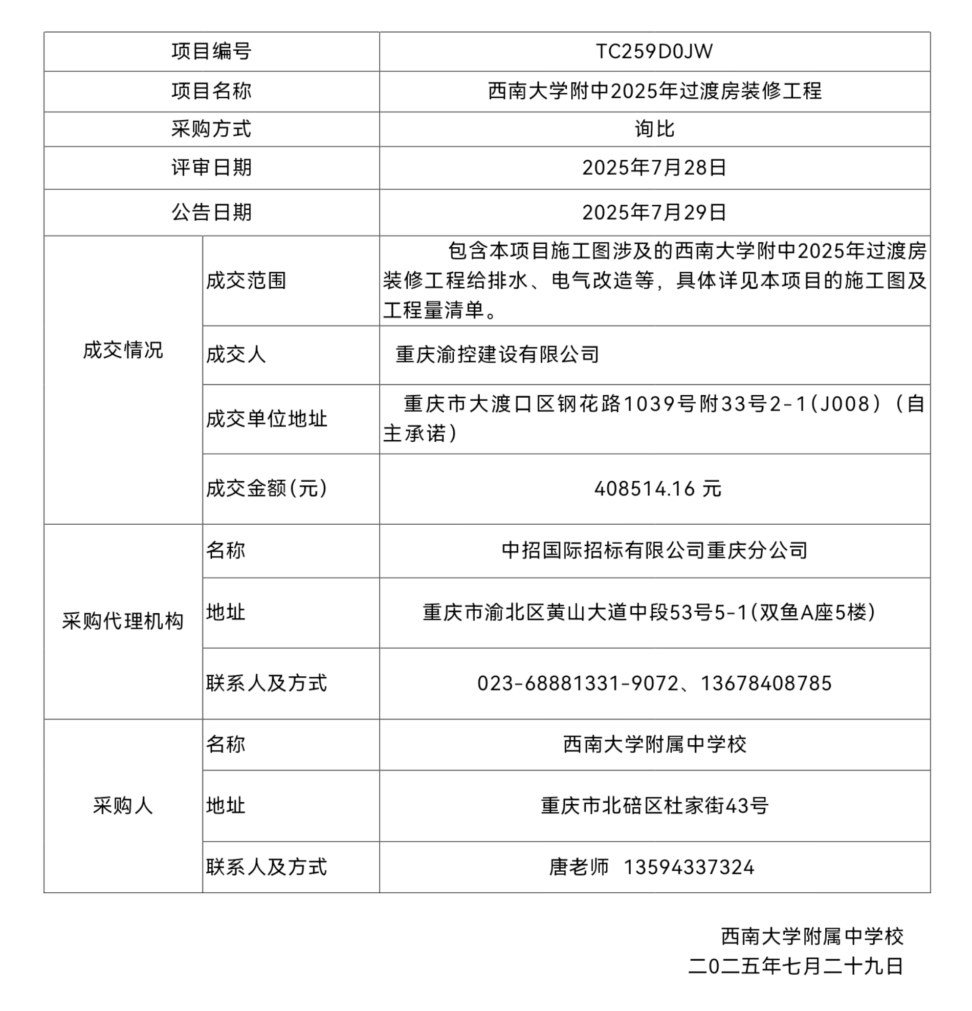 PA视讯附中2025年过渡房装修工程成交结果公告