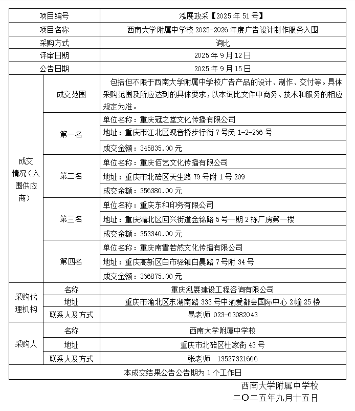 PA视讯附属中学校2025-2026年度广告设计制作服务入围成交结果公告