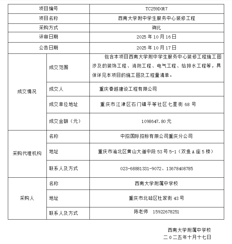 PA视讯附中学生服务中心装修工程成交结果公告