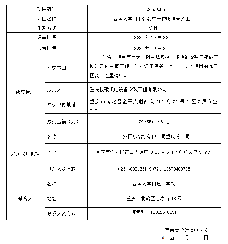 PA视讯附中弘毅楼一楼暖通安装工程成交结果公告