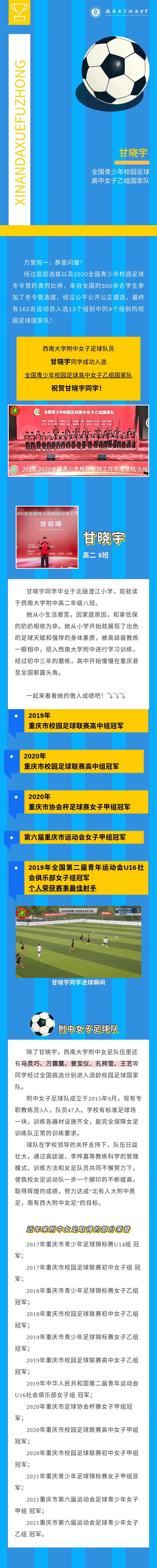 高2022届甘晓宇同学成功入选全国青少年校园足球高中女子乙组国家队
