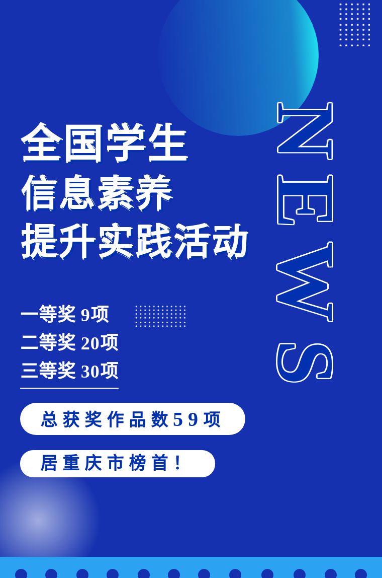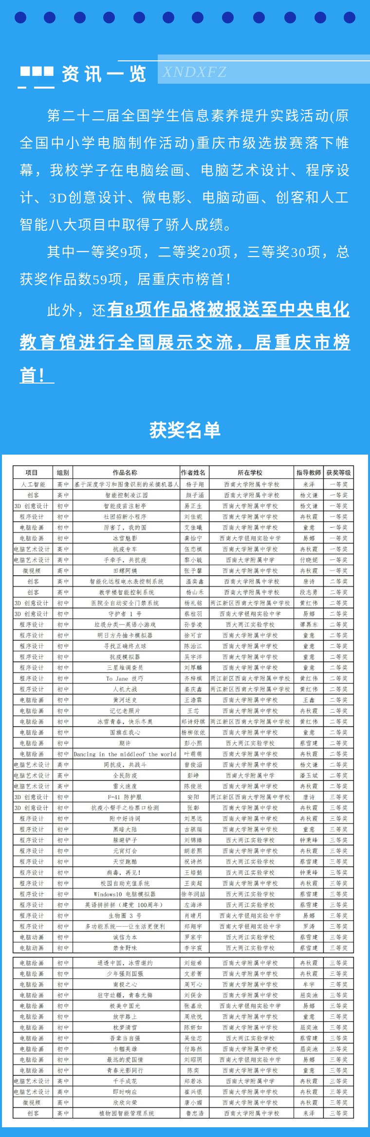 附中学子在第二十二届全国学生信息素养提升实践活动中获9个一等奖,共59个奖项,居重庆市榜首!