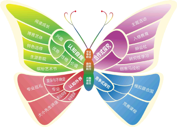 促进课程以综合实践活动承载生涯唤醒、认识自我、认识外界等生涯主题内容。促进课程中,包括“入格教育”、缤纷社团活动、“彩虹生涯影院”“专业巡礼”“大小先生”讲座、专业研学与大学研学、见习实习、职业体验等实践形式,与基础课程协同,以理论与实践相结合的方式帮助学生深入认识自我,认识外界。