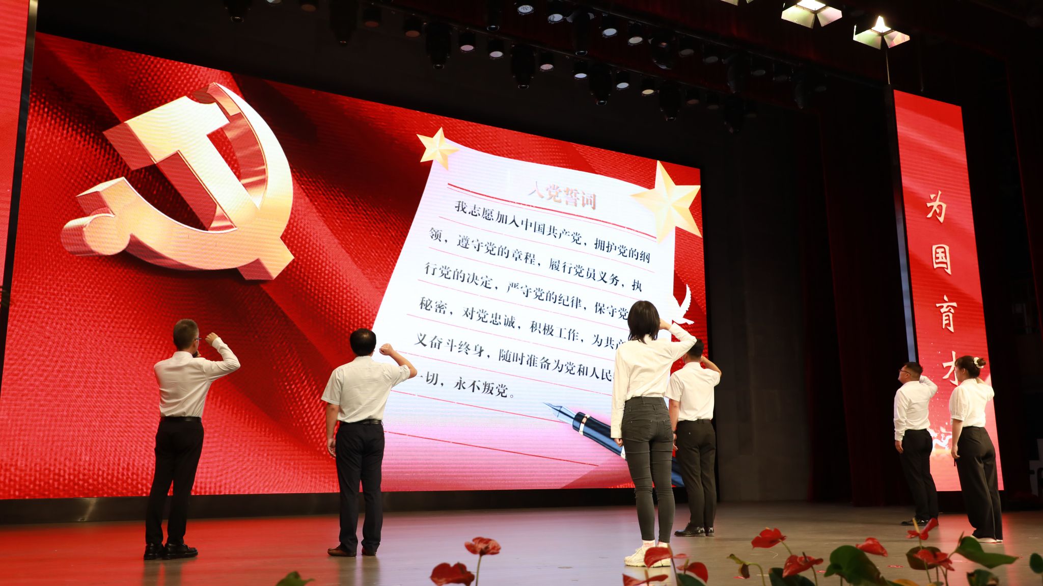 誓言铮铮、久久回响。七位新党员站在鲜艳的党旗下进行了入党宣誓仪式,由新发展党员代表刘建勇领誓,全体党员举起右拳,高声宣读,重温入党誓词。