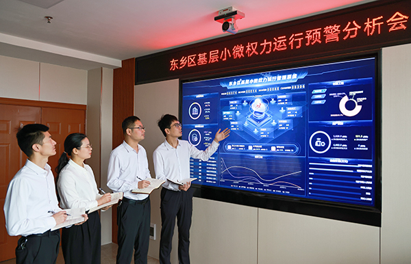 江西省各级纪检监察机关充分运用大数据赋能基层监督,推动小微权力规范运行。图为近日,该省抚州市东乡区纪检监察干部利用大数据平台进行基层小微权力运行预警分析。舒利光 钟天明 摄影报道