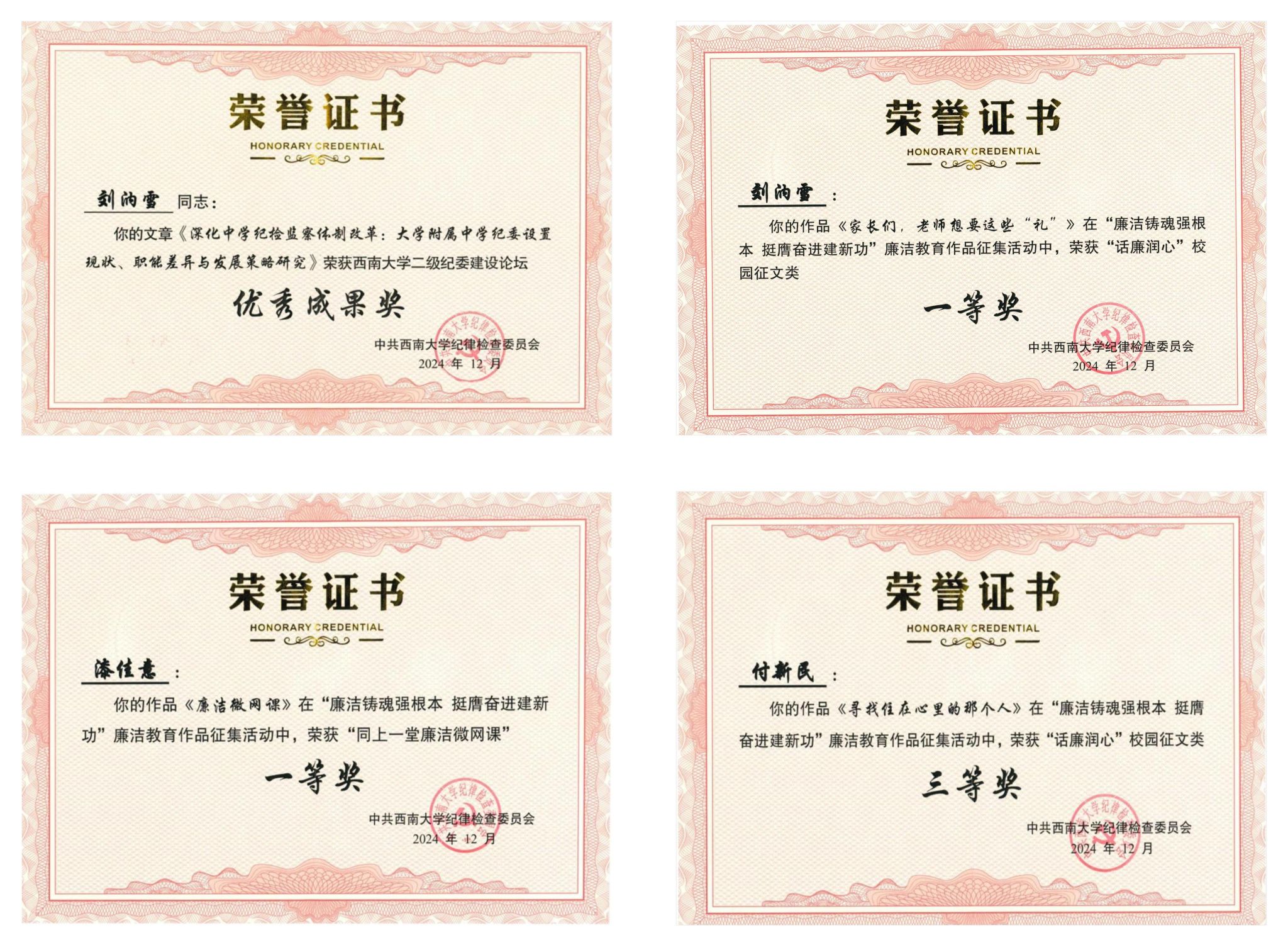 党委副书记、纪委书记刘汭雪创作的《深化中学纪检监察体制改革:大学附属中学纪委设置现状、职能差异与发展策略研究》荣获优秀成果奖。