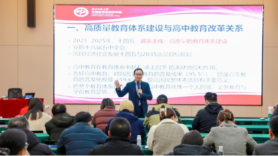 仪式结束后,薛二勇教授为学员们带来开班第一讲。他围绕高质量教育体系建设与高中教育改革关系,从政策导向出发,强调教师教学应以核心素养为纲,注重创设真实情境,重视给学生安排表现性任务,坚持一致性评估。整场讲座内容丰富、见解深刻,领航计划全体学员及其他利用课余时间听课的教师们深受启发,对高中教育有着更深入的理解,纷纷表示收获颇丰,并期待学校能够搭建更多学习交流平台。