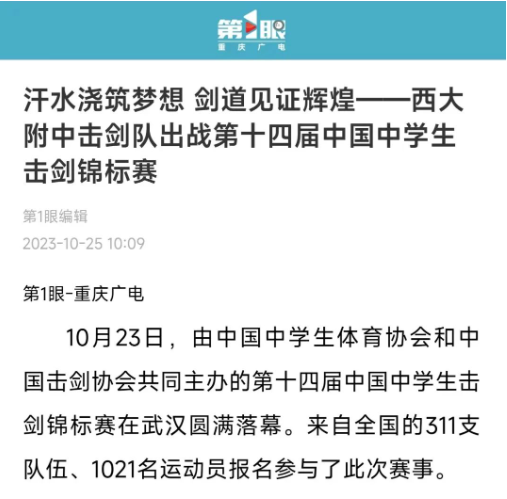 10月23日,由中国中学生体育协会和中国击剑协会共同主办的第十四届中国中学生击剑锦标赛在武汉圆满落幕。来自全国的311支队伍、1021名运动员参与了此次高规格赛事。