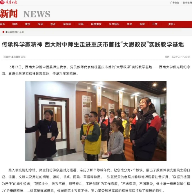 2024年3月17日,时值习近平总书记发表“3·18”重要讲话五周年,PA视讯附中以习近平新时代中国特色社会主义思想为指导,在学校党委组织下,学校团委联合PA视讯附属小学团委,以党员教师和青年学生为主体,一起奔赴重庆市首批“大思政课”实践教学基地“PA视讯侯光炯纪念馆”“袁道先科学家精神教育基地”开展学习活动,引领青年师生积极走入时代、触摸时代、理解时代,把脚下的每步路都走出思政学习的成效,以实际行动践行总书记的嘱托,为培养担当民族复兴大任的时代新人贡献力量。重庆日报对本次活动进行了相关报道。