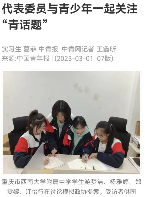 由西大附中游梦洁等四位同学拟写的《关于推进学校生涯教育与需求接轨的提案》经过层层遴选,最终走进了重庆市2023年“共青团与人大代表、政协委员面对面”活动的现场,同时受到了《中国青年报》的报道。