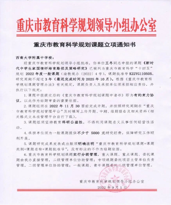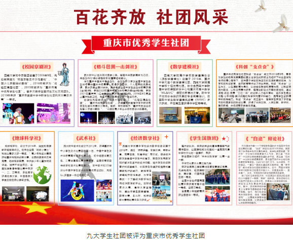 2018年至今,我校九大学生社团被评为重庆市优秀学生社团:击剑社、京剧社、国旗班、武术社、数学建模社、地理科学社、科学“支点会”、经济数学社、“自迩”辩论社。