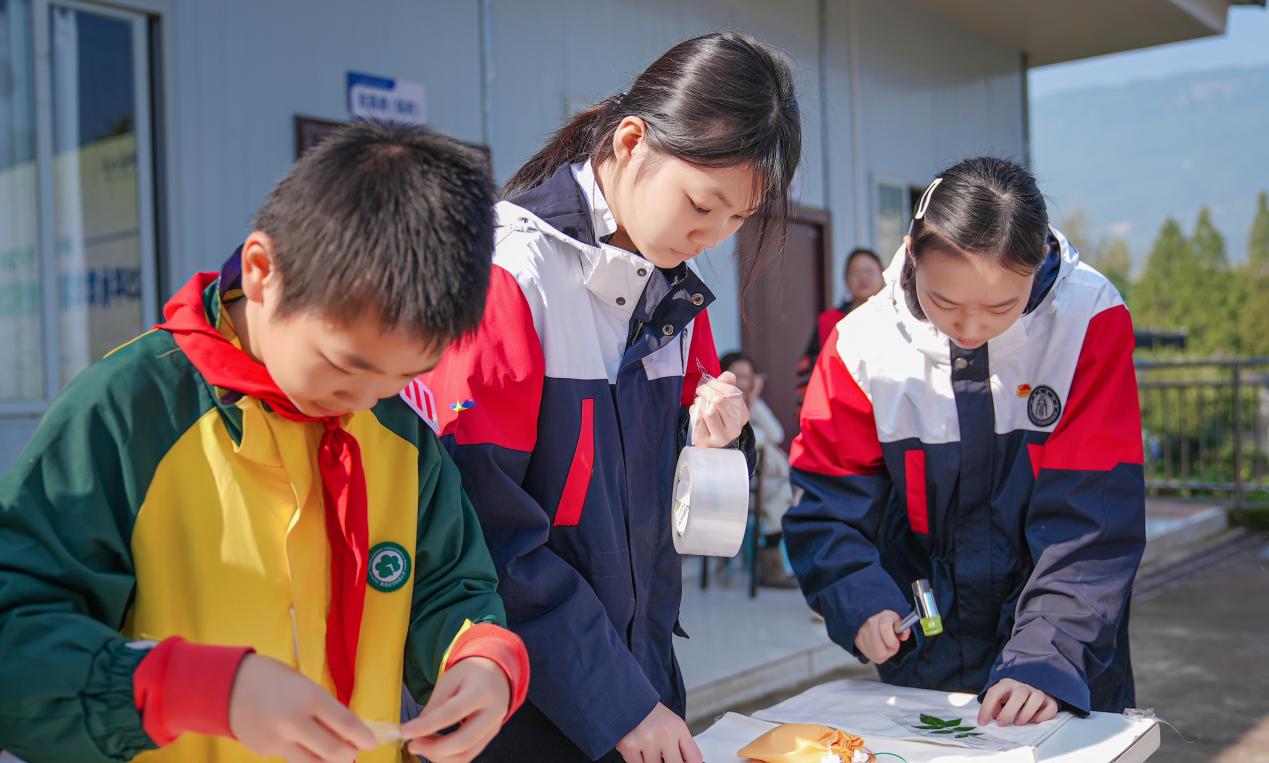 活动现场还设置了“重阳香囊手工坊”、“植物拓印手工坊”及插花课堂,成为文化传承的生动载体。在香囊工坊,学生们按古法配方填充艾草、薄荷等药材;植物拓印区,大家采集银杏叶、桂花枝等秋日素材,将自然纹理拓印于帆布包;插花课堂上,大学志愿者指导附中弟弟妹妹修剪花枝、搭配色彩;在劳动成果品尝区,大家兴奋地品尝着劳动带来的香甜,体会食物背后的文化内涵。