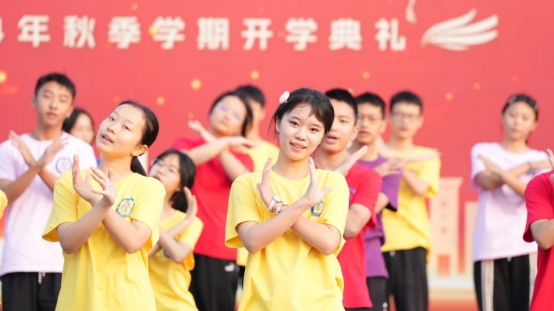 刚刚踏入校园的高一同学们为全校师生献上了整齐优美的《红旗飘飘》手语舞。无需语言的修饰,同学们用一双双灵巧翻飞的手表达着骄傲与自豪,激励着附中师生自强不息,君子不器。