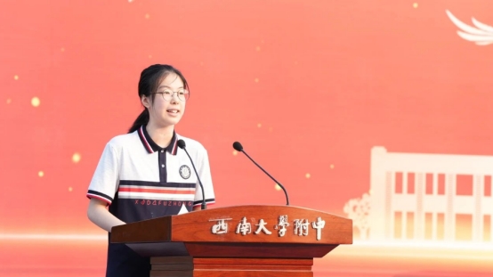 高一1班的新生彭欣然同学作为学生代表发言,分享了她对青春的领悟:“很幸运,我们正值青春,以微毫诠释盛大,我们曼妙风姿里,就是生命,我们轻盈飞过处,就是天空。年少,本就有梦,有梦,就去追吧!哪怕路上有风雨急骤,有孤夜寂寥。”她鼓励大家为梦奋斗,做朝气蓬勃的附中人。