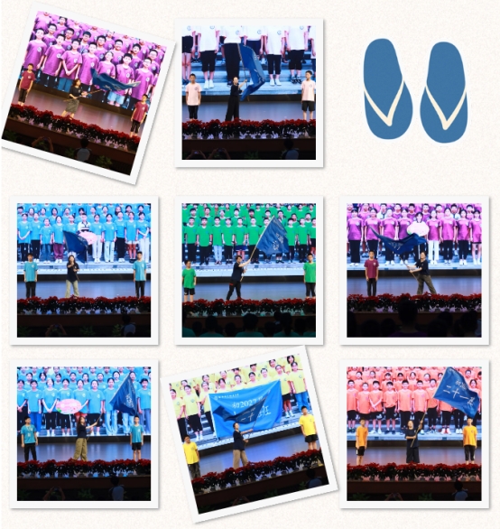 旗手就位,授旗!授旗仪式以班为单位进行,班主任在台上挥舞班旗,旗手郑重接过。各班的小成员们热情地喊出口号,荧屏上的班徽及班级照片,都是一段不可复制的青春。