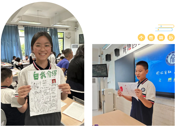 每位初一新生都带来了独具个性的简历。五彩斑斓的简历上,不仅有自己的兴趣爱好、性格特点等信息,还配了生活照、自画像。同学们依次上台介绍自己,几十分钟下来,彼此之间已经不再陌生。