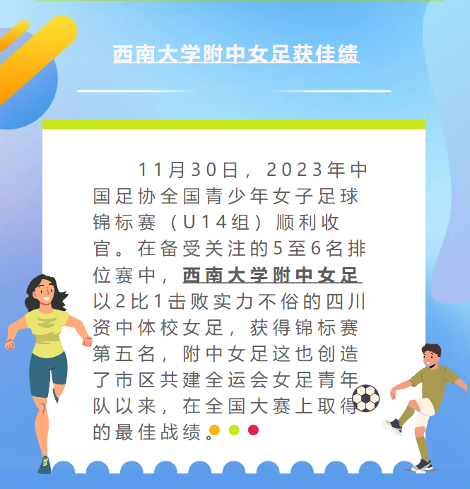 5至6名争夺战,附中女足迎来了与老对手资中体校的对决,小组赛首轮,球队曾0比3不敌对手,本次再次交手,全队上下秉着一股劲,势要拿下这场川渝德比胜利。最终,经过90分钟鏖战,附中女足以2比1顽强战胜资中体校,夺得全国第五名。