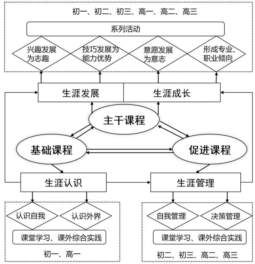 主干课程指向生涯教育与学科课程、综合实践活动的深度整合,让学生在学科课程与综合实践活动中实现生涯成长与生涯发展,逐步引导学生将兴趣发展为志趣,将技巧发展为优势,将意愿发展为意志,最终形成专业、职业倾向。开设学段为初一至高三。
