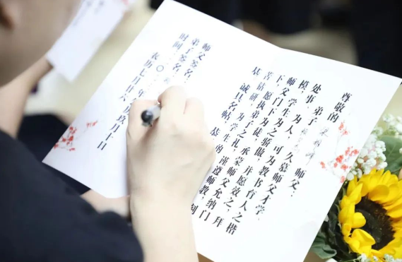 各位师父欣然接过了弟子们的心意,也在拜师帖上签下了姓名。“君子尊德性而道问学,致广大而尽精微,极高明而道中庸,温故而知新,敦厚以崇礼。”这是整个人类至高无上的学术和人格追求,也是一种“力斡造化,贯通天人”的境界。师魂相传,桃李成荫;守先待后,此道大哉。