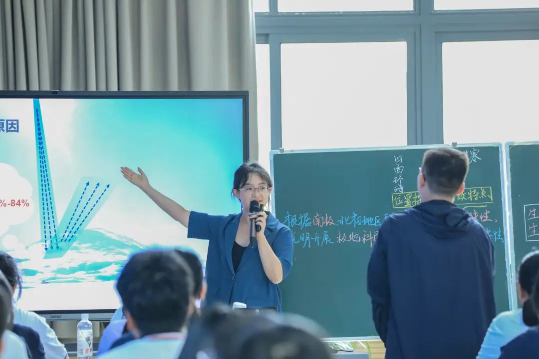 地理组张瑞琳、生物组王颖老师共同执教,进行了主题为《透过企鹅看南极》的教学展示。课堂通过有趣的视频引入,引导学生观察企鹅的外形特征,从生物适应环境的角度设问,引导学生推导南极地区气候寒冷的环境特点。接着,张瑞琳老师通过实验启发学生从南极特殊的地理位置、地表覆被、海拔高度等角度探究南极独特气候的产生原因;王颖老师则引导学生结合企鹅的生活习性与排遗特点进一步探索企鹅的食物来源,以增进学生对南极科考的认识。课堂最后,学生根据企鹅进化过程等材料探究南极的环境变迁,并深入了解人类活动对生态系统的影响,节能环保、人地协调的观念根植于心。