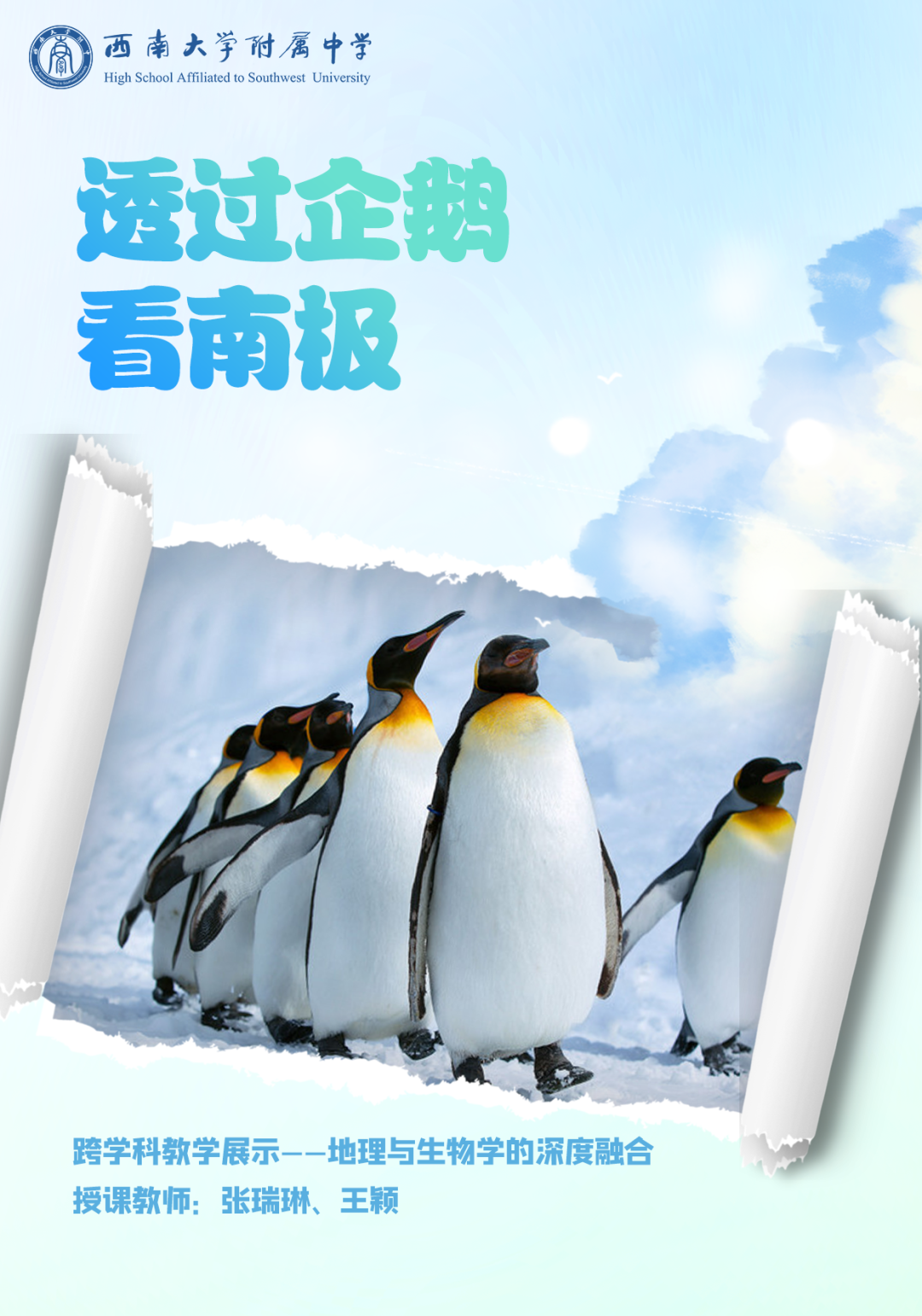 2022年颁布的《义务教育课程方案》强调进行跨学科学习,强化课程育人功能,新课标对跨学科的教学实践提出了新的要求。在重庆市重点课题《初中地理生物融合创新课堂探索及评价策略研究》的基础上,西大附中持续开展多次基于地生融合的教学展示和研讨活动,本次活动进行了主题为《透过企鹅看南极》的教学展示,是继《走近科学之人类真的起源于非洲吗》《城市空间和野生动物》后的第三次教学创新尝试,这一精彩课例由地理、生物教研组共同完成。