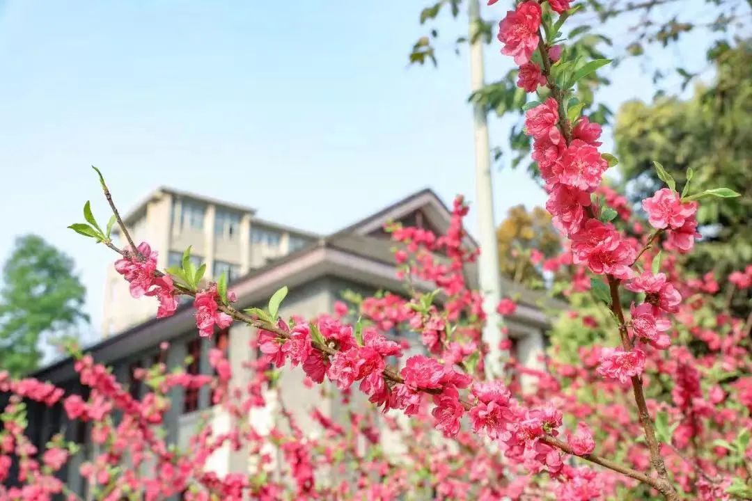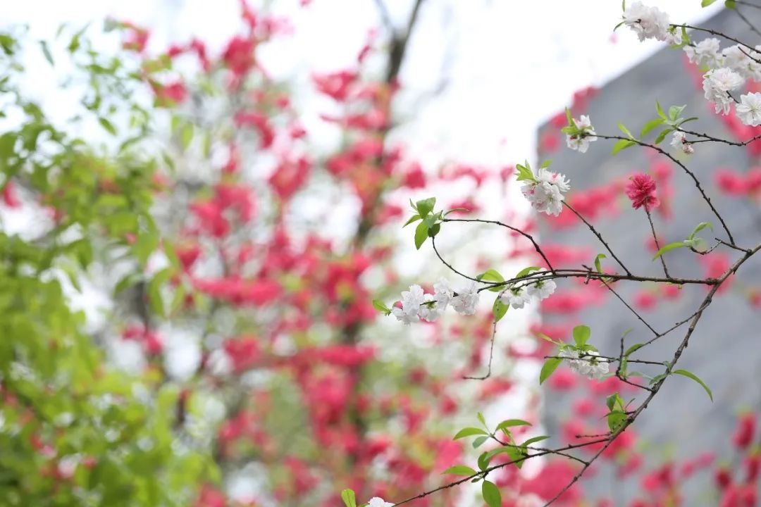 从思齐阶往下走。抬头,那棵碧桃总会在那儿迎接你。棕褐色的枝条载着满满的,娇翠欲滴的碧桃花越过木牌,活像一个调皮的小朋友总想往高处攀。这棵碧桃,既显眼,出入教学楼一眼就能看到;又落寞,是一片风景只一花的孤单。