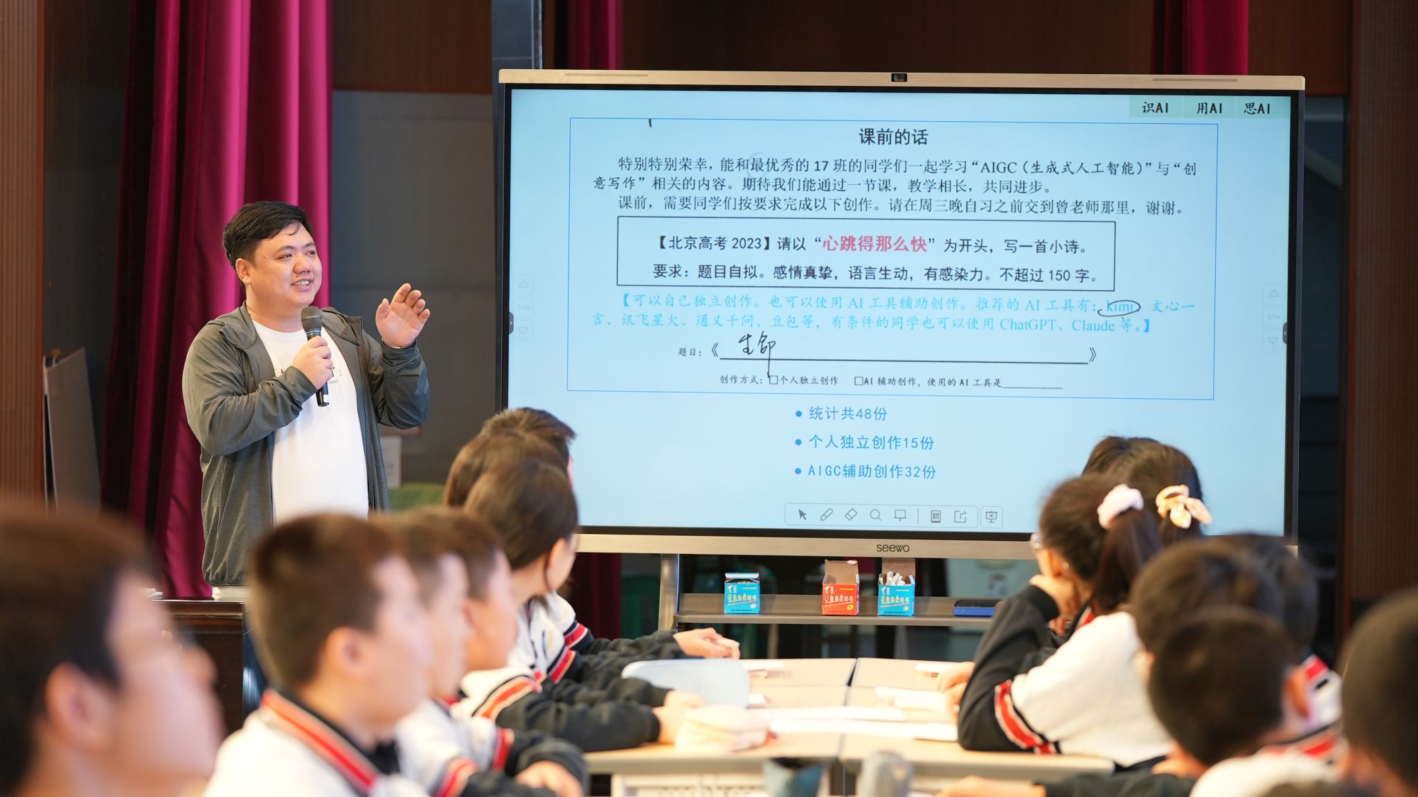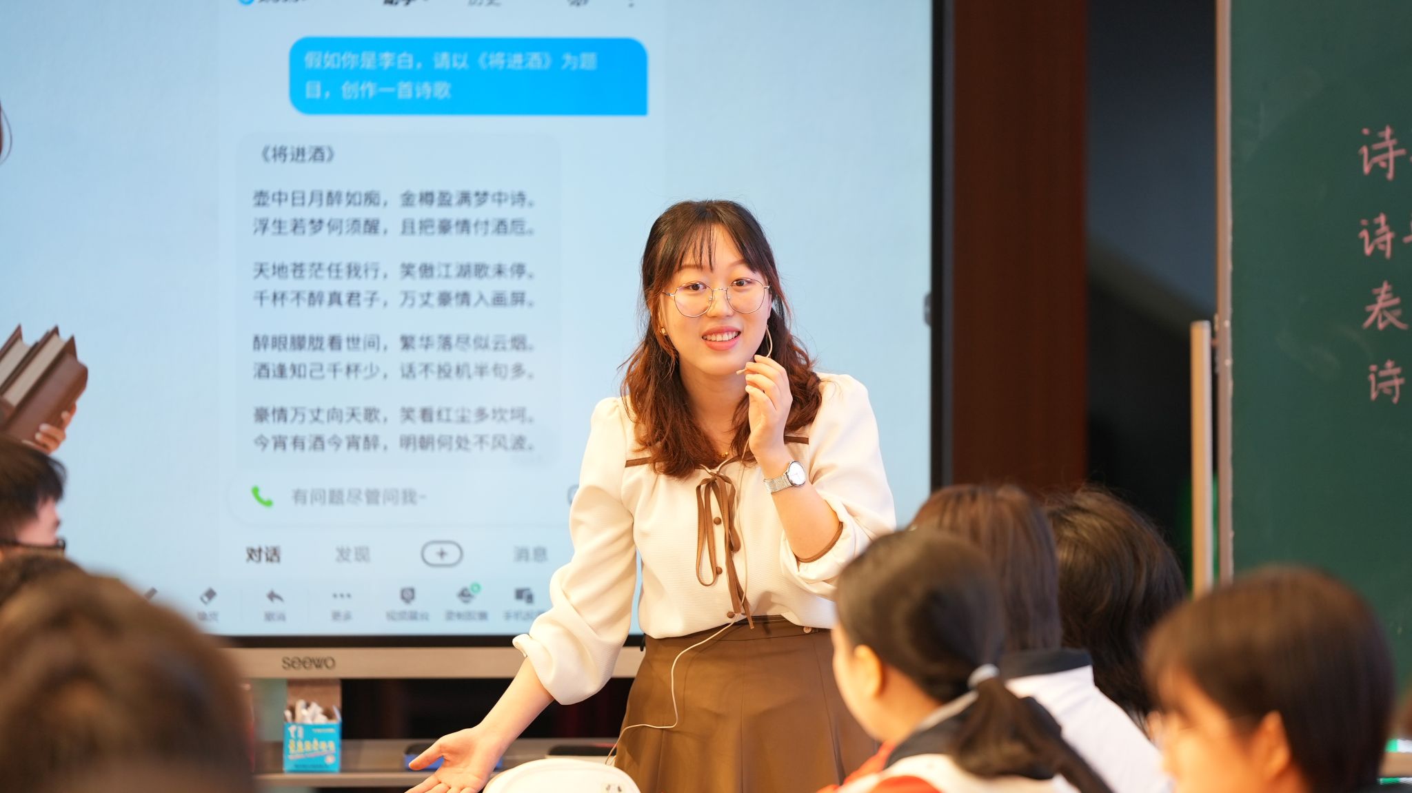 杨润雨老师授课的题目是《与AI比武,“诗情画意”共绘未来》。杨老师请来诗仙李白,又找来AI小白,通过现场答题PK,让学生在规定的时间内准确判断出所给诗句与诗人是否匹配。杨老师精心设计了三个学习任务,学生朗诵、小组讨论、文学短评撰写,课堂有了丰富的呈现形式和深度的学生参与,先进的人工智能与精美的《长安三万里》动画相得益彰。同学们认识到了,原来李白和小白的差距,就在“AI工于文辞而拙于心性”。