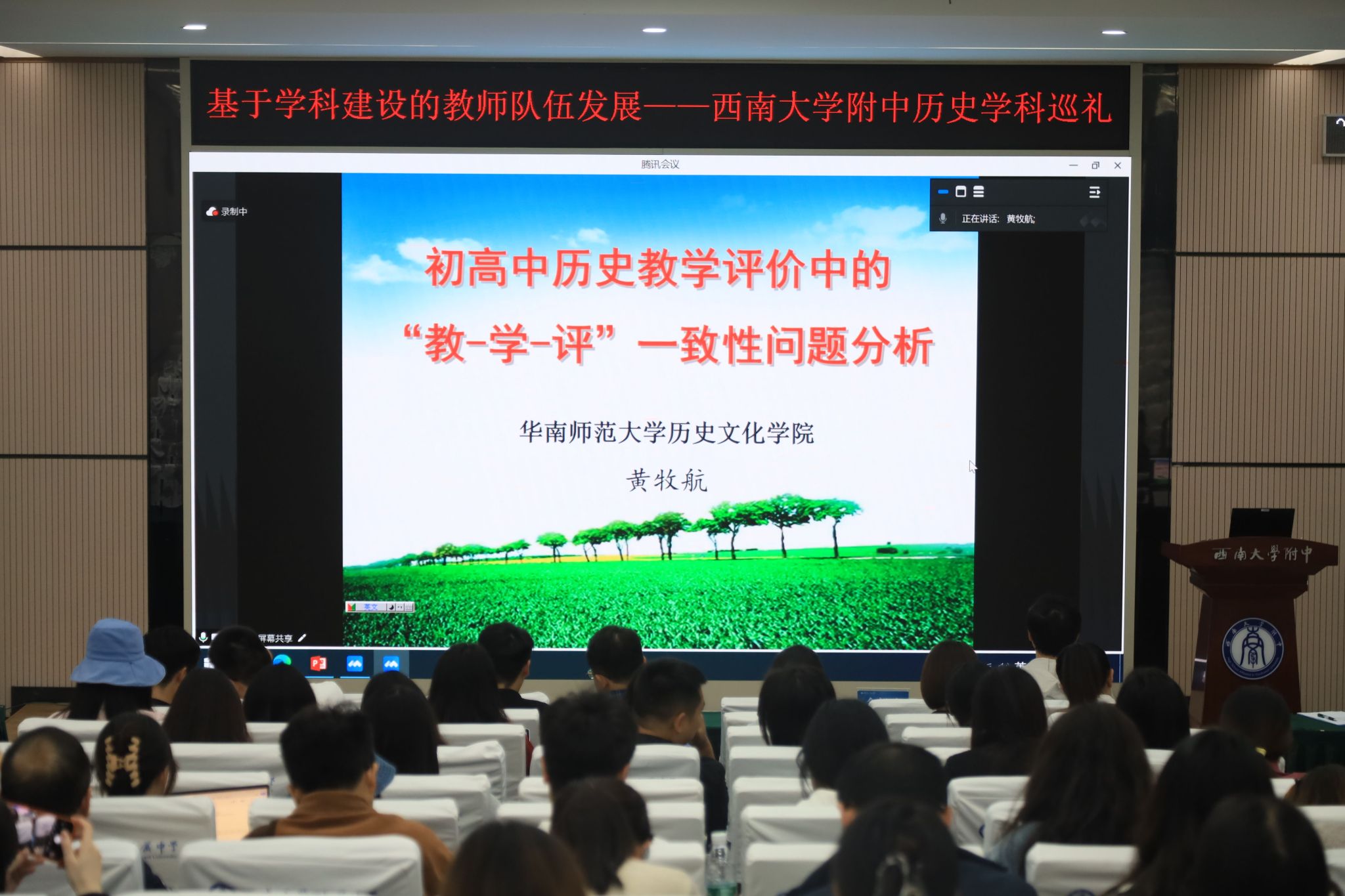 华南师范大学历史文化学院黄牧航教授开展“初高中历史教学评价中的‘教-学-评’一致性问题分析”的专题讲座。在讲座中,黄教授从“教-学-评”一致性理念分析、基于表现标准的“教-学-评”一致性分析和历史学科核心素养分层测评的研究建议三个方面深入探讨了如何将教学理念、教学设计和教学评价有效融合,从而发挥教学评价的育人功能。黄教授指出,在未来的教学和命题中,教师应坚持基于标准和教材的评价理念,加大对考试测量中行为动词以及中学历史核心素养导向命题规律的研究力度,进而实现“教-学-评”一致性,提高历史教学和评价的质量。