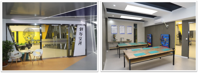 创客空间的打造包含了设计区、讨论区、展示区、加工区、机器搭建区等,在这个区域里是合,针对有特长的学生可以在里面将一个产品创意、设计、技术试验到最后物化成品的过程进行整体的深度体验。