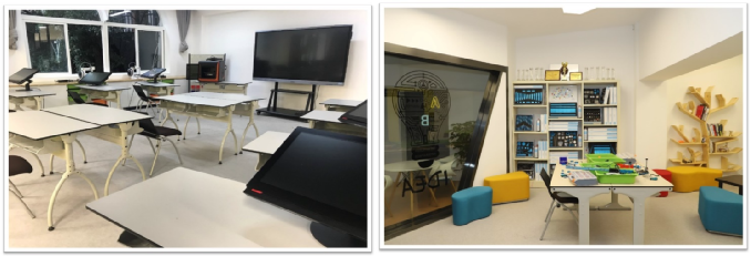 整个STEAM中心的其他实验室又是针对于每一个板块建立大班化教学的空间,比如:机器人实验室、3D打印实验室、电子工程实验室、技术设计室、技术实验室、财商实验室等等,利用通识课程和选修课程让更多的学生参与到过程中来,更大化的利用空间,更大化的开展STEAM教育。