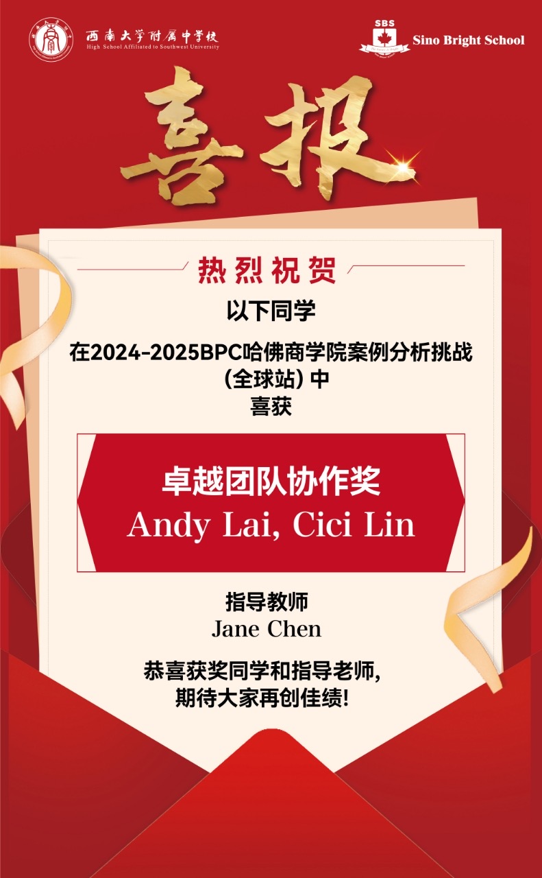 2025年1月,西附国际3支队伍前往上海参加BPC(Business Pioneer Case Challenge)哈佛商学院案例分析挑战全国站,最终1支队伍突破重围,成功晋级全球站。3月,这支队伍整装出发,横跨太平洋,直抵哈佛,在国际舞台上迎接全新挑战。