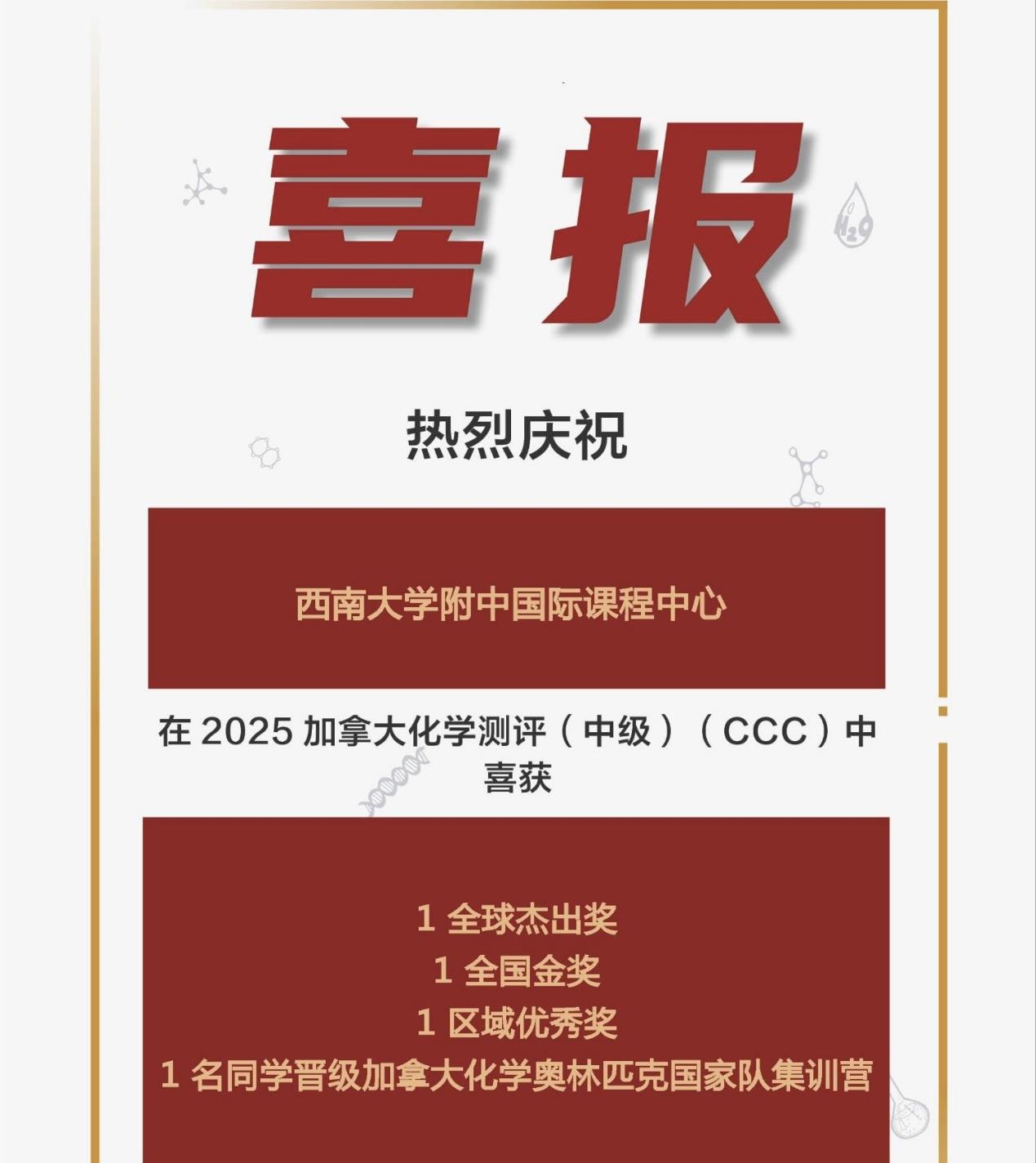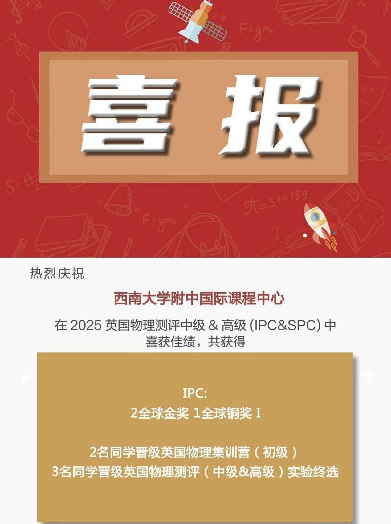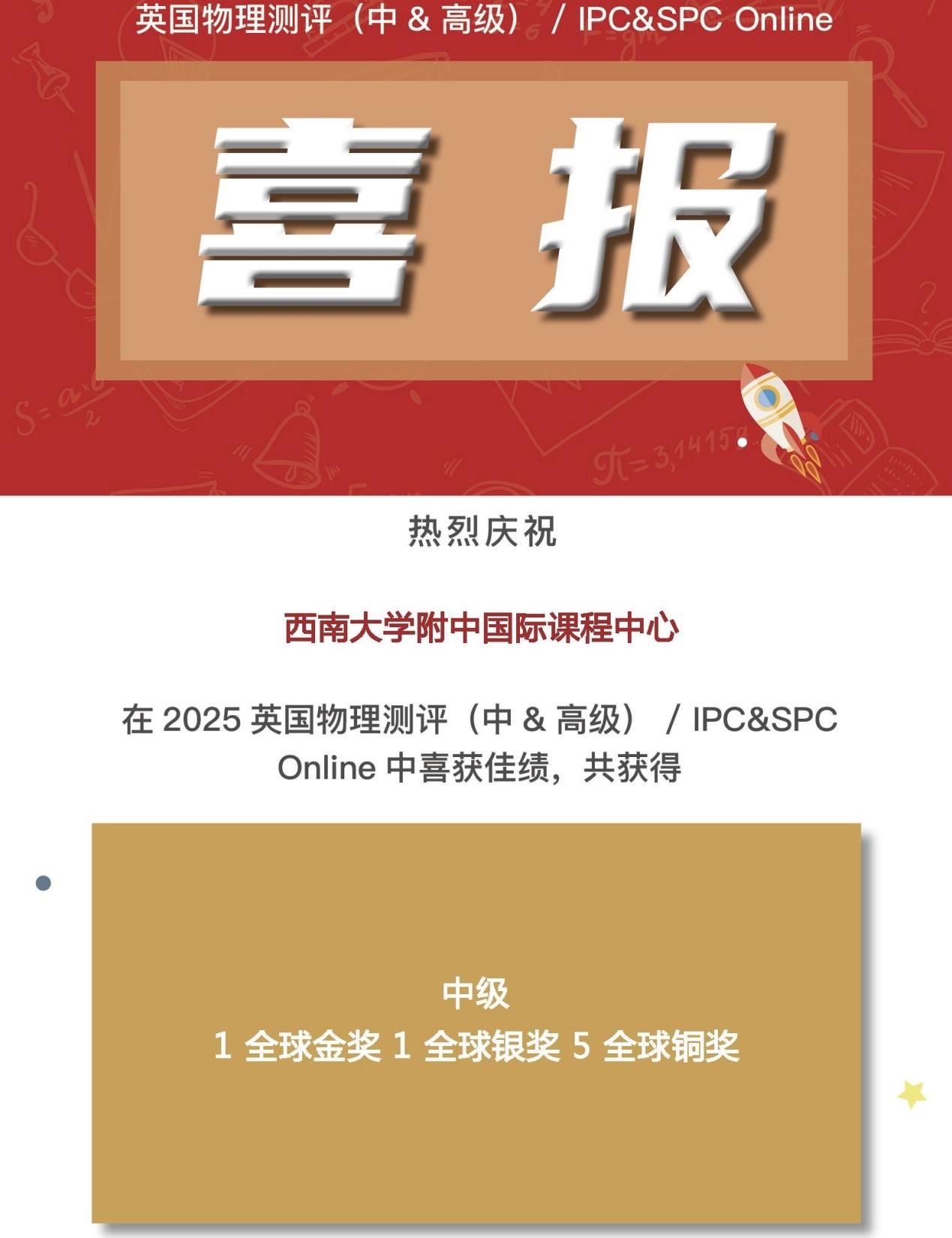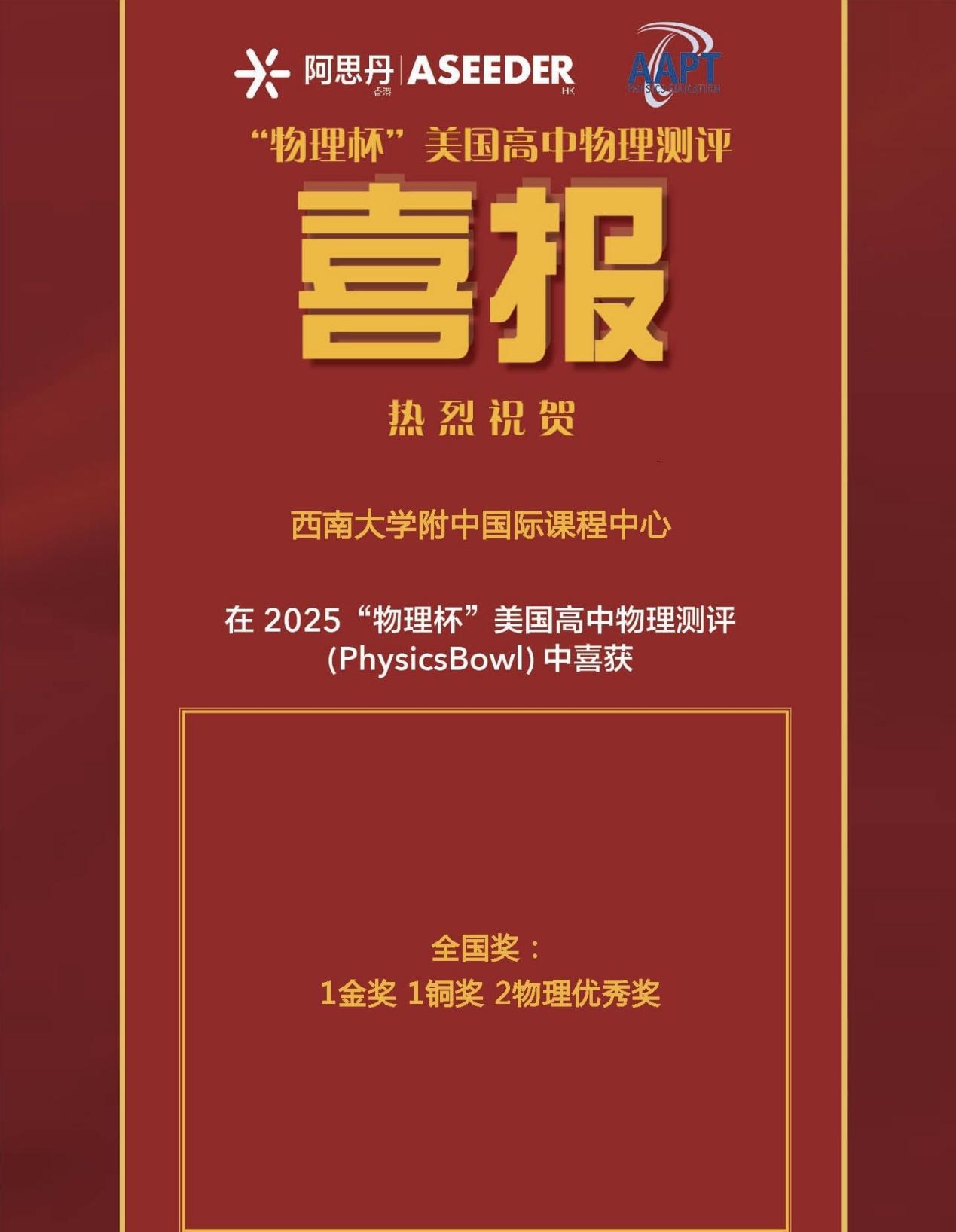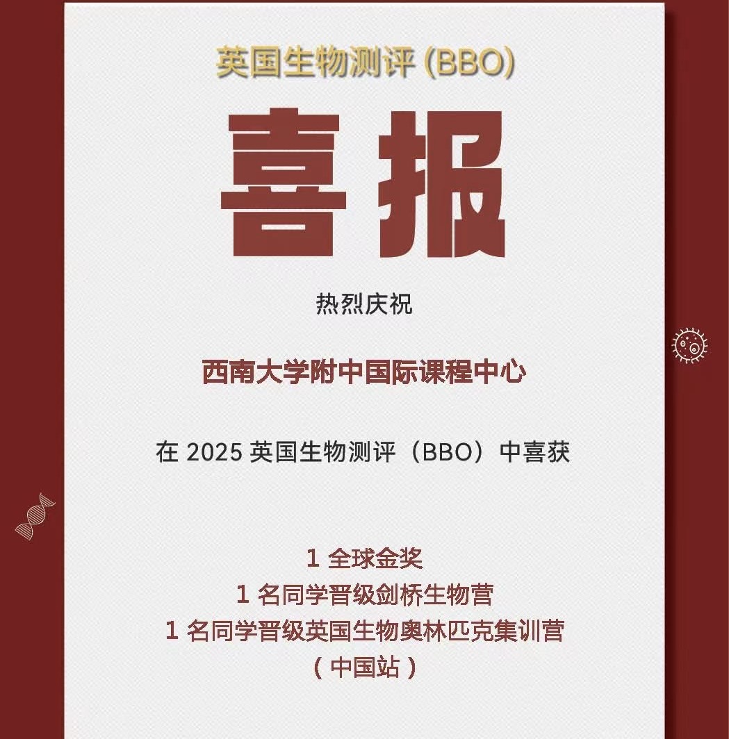 2025年春季学期,PA视讯附中国际课程中心学子在多项国际竞赛中表现优异,捷报频传,累计斩获全球及全国级别的奖项共计50余项,涵盖数学、物理、化学、生物等多个学科,充分展现出中心学子扎实的学科基础与出色的综合能力。其中,多位学子在国际权威学科测评中脱颖而出,荣获英国生物测评(BBO)全球金奖、加拿大化学测评(中级)(CCC)全球杰出奖、英国物理测评(BPhO Round1)全球铜奖、英国物理测评中级&高级(IPC&SPC)全球金奖等重磅奖项,诠释了敢于挑战、不断超越的精神风貌。