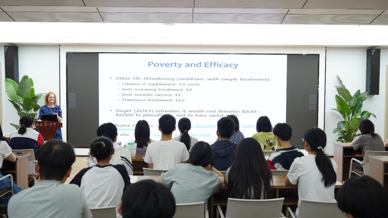 讲座伊始,Ashford博士引用澳大利亚哲学家、现代功利主义代表人物Peter Singer关于道德义务的经典论述,通过“池塘救人情景”和“捐助50美元救助一名孩童”的案例分析,引导学生设身处地思考:如果一个简单的举动足以改善他人的处境,我们是否有必要这样做?Ashford博士进一步阐释道,在Singer看来,助人不仅关乎美德,更是一种责任。这种义务无关距离,而是出于对生命的关切。谈及全球贫困问题时,Ashford博士指出,每个人都可以在力所能及的范围内伸出援手,这些看似微小的行动,正是一种切实可行的正义实践,汇聚起来便能产生改变的力量。