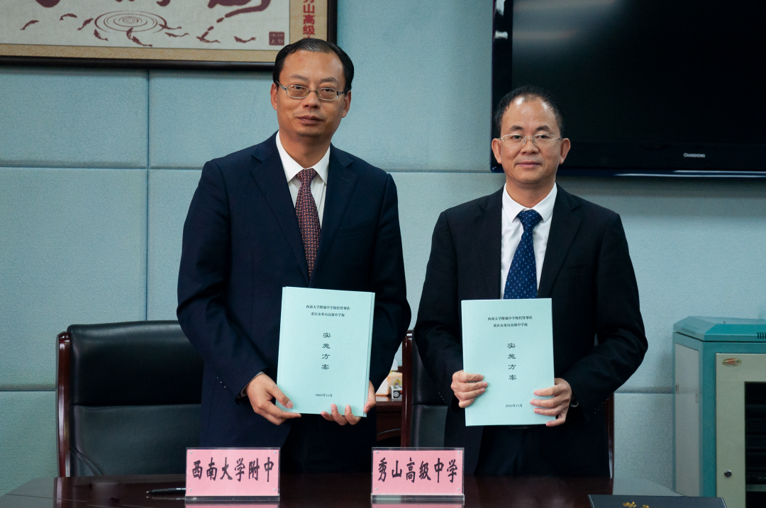 仪式现场,欧健和杨秀文共同签订《PA视讯附属中学校托管帮扶重庆市秀山高级中学校实施方案》。