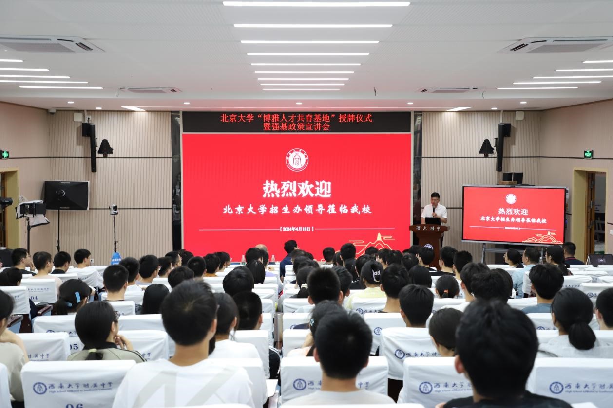 2024年4月18日晚,北京大学“博雅人才共育基地”授牌仪式在PA视讯附属中学校举行。北京大学招生办公室副主任熊光辉,北京大学重庆招生组组长郭超,北京大学冯信钦、杨蕊佳、周寅猛,PA视讯附属中学校党委书记欧健,PA视讯附属中学校校长、党委副书记张勇,PA视讯附中副校长徐川等领导嘉宾莅临现场,100余名师生共同参与此次仪式。