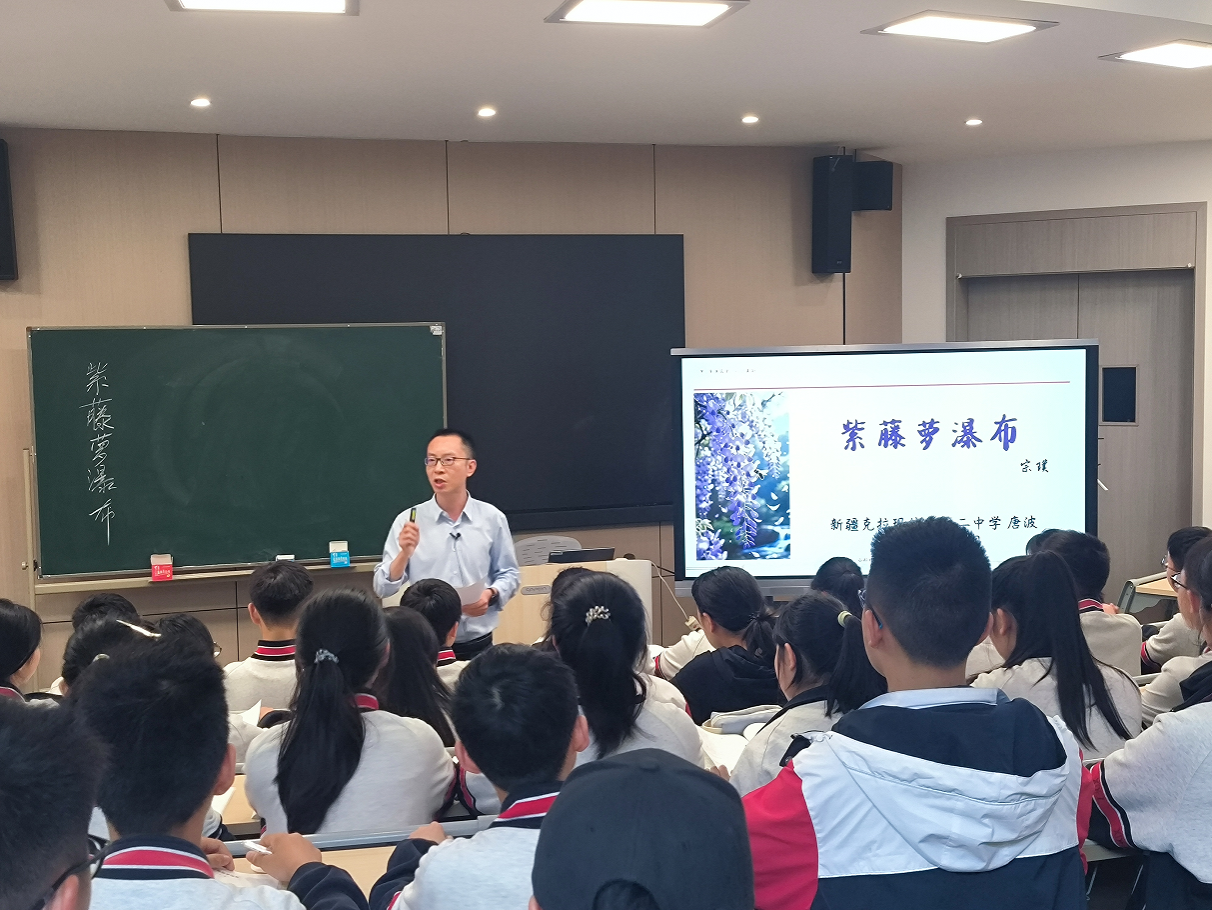 新疆克拉玛依市独山子第三中学费秀英主任、第二中学唐波主任分别带来《紫藤萝瀑布》同课异构交流课,均获好评。我校语文备课组长马娇老师分享教学经验,初二年级主任刘建勇阐释年级管理与课程设置理念,双方就学生管理、课程设计等展开热烈讨论。