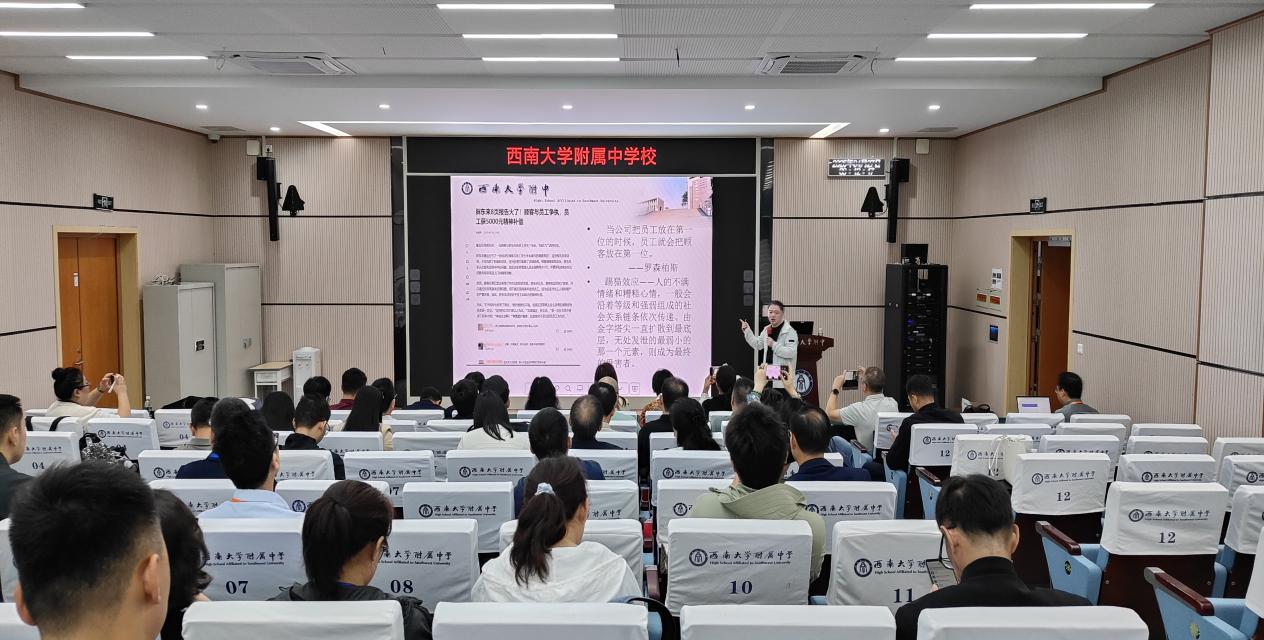 学校教师发展中心陈海亮主任以“核心素养导向的教师专业发展”为题作专题报告。他系统介绍了学校“基于学科建设的师资队伍建设”为核心的教师培养体系,重点阐释核心素养导向下教学观的重构策略,强调从知识本位向素养本位的转变,并结合典型案例分享跨学科融合、情境化教学等课堂变革实践。参训人员围绕教师评价激励机制、校本研修模式等议题展开深入研讨。