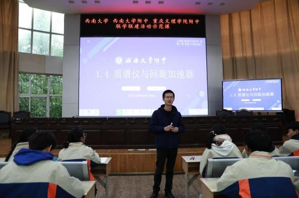 在教学示范环节,西大附中党员教师代表董杰和喻定钧分别呈现了一节高一数学示范课和高二物理示范课,赢得满堂彩。董杰老师聚焦函数单调性,巧妙激发学生主动思考探究,课堂氛围轻松愉悦。喻定钧老师以质谱仪与回旋加速器为主题,融入我国在相关领域的成就及渝青情谊,实现了学科德育与课程思政的有机融合,为学科思政教育提供了新视角。两位教师的卓越表现,不仅彰显了西大附中党员教师的教学功底与先进理念,也展现了党员在教育教学中的引领作用和先锋本色,为文理附中的同仁提供了宝贵的教学范例与启示,为深化两校教育合作与交流奠定了坚实基础。