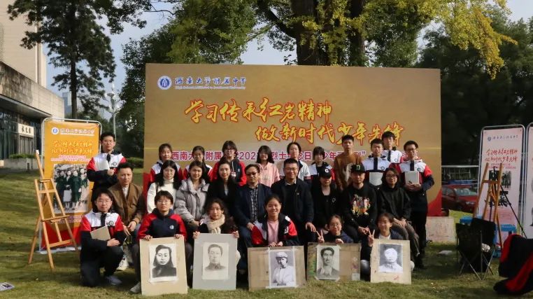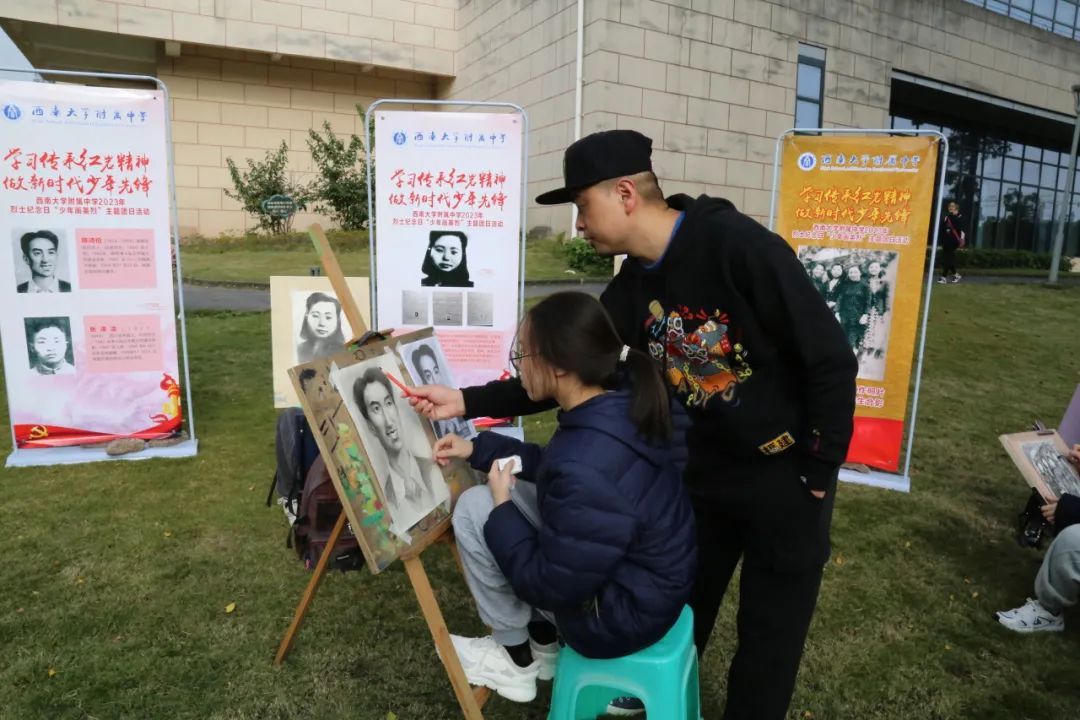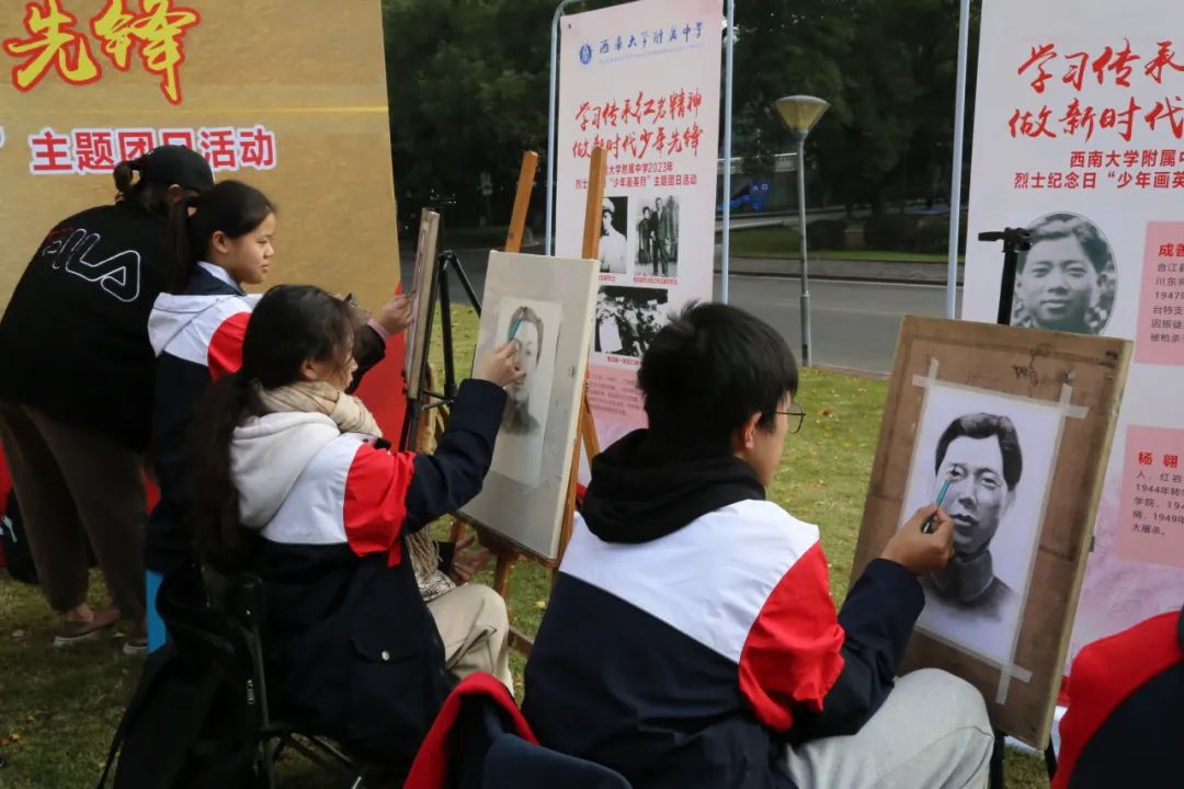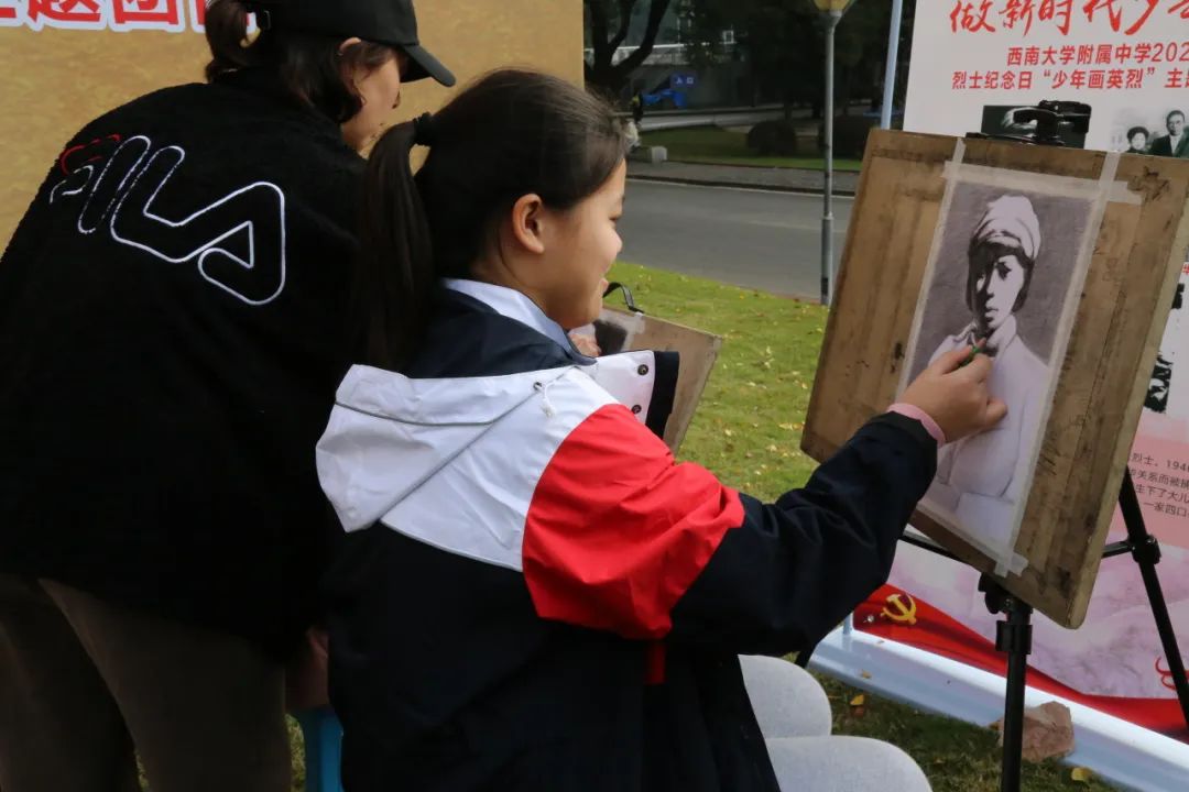 校史馆前的草坪上郑劲松馆长给同学们上了一堂生动的思政教育现场实践课,学生们聆听着著名英烈江姐当年联系国立女子师范学院的事迹,赞叹着陈诗伯、张泽浩等红岩烈士的革命英雄主义精神,学英雄,画英雄,追念英雄,致敬英雄。美创班的学生们架好画板,拿出画笔,满怀敬畏之心,开始一笔一笔地临摹先烈肖像。学生会成员则是拿出纸笔,写下了自己参加此次活动的感悟。孩子们的笔触满怀深情,“下笔春蚕食叶声”,一笔一划,触碰着我们身体的一个个细胞,激起了我们灵魂深处的一次次感动。