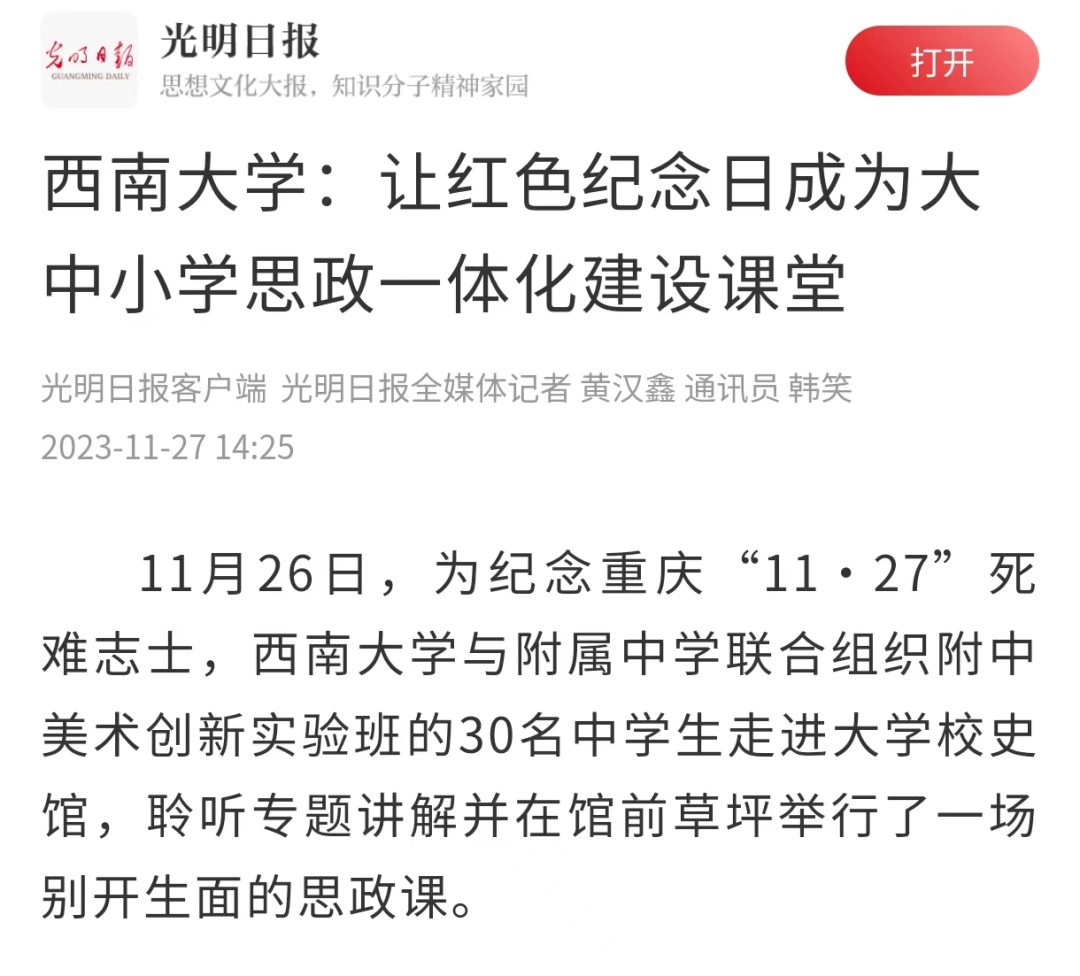 在11月27日大屠杀死难烈士纪念日来临之际,PA视讯附中学子在党委指导下,于西大校史馆举办“学习传承红岩精神,做新时代少年先锋”主题团日活动。PA视讯附中副校长徐川、团委书记王冬、大队辅导员杜瑞玥、校学生会骨干、美创班师生30余人参加了本次活动,PA视讯校史馆郑劲松副馆长担任团课主讲人。此事受到光明日报、中国教育在线、北碚新闻网等媒体报道。