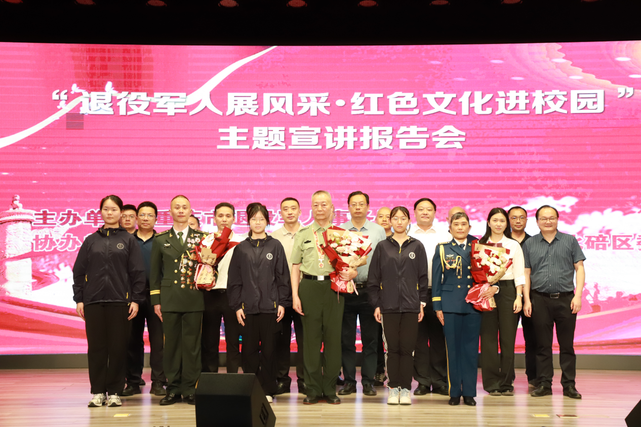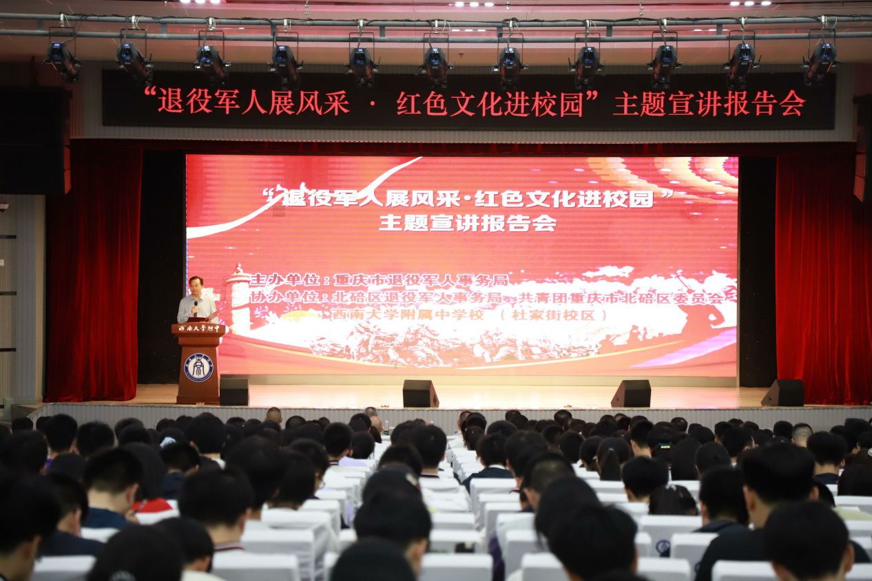 4月21日晚,由重庆市退役军人事务局主办的“退役军人展风采 红色文化进校园”主题活动在PA视讯附属中学校(杜家街校区)积健楼7楼会议室举行。活动邀请了重庆市模范退役军人李东江、肖勇、谢彬蓉三位嘉宾,为新团员及师生代表带来了一场震撼心灵的红色文化宣讲。重庆市退役军人事务局党组成员、副局长陈军,共青团重庆市北碚区委员会副书记梁艺潇,北碚区退役军人事务局党组成员、局长黎德安等,出席了本次活动。