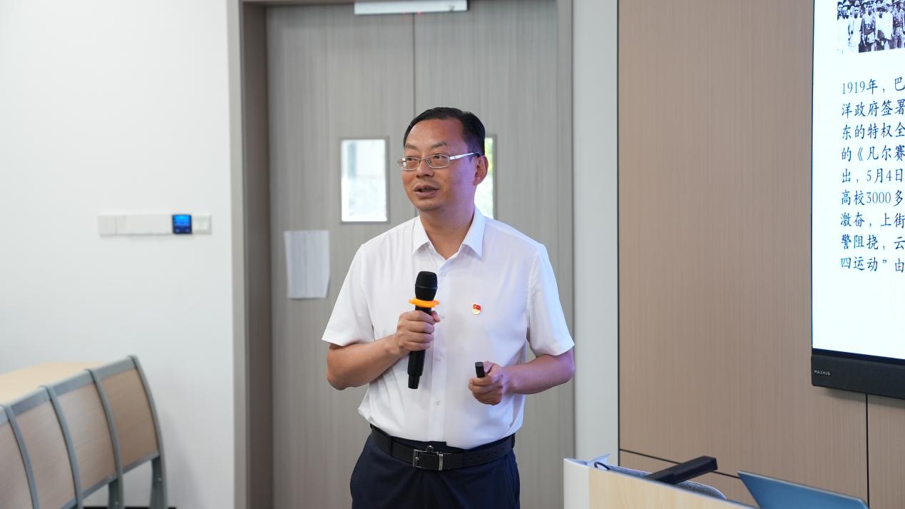 通过珍贵的历史影像资料,欧书记带领同学们重温了五四运动中闻一多先生“爱国家书”的感人故事。当大屏幕上展示出“国家育养学生,岁糜巨万,一旦有事,学生尚不出力,更待谁人”的手迹时,在场师生无不为之动容。欧书记指出:“五四精神的核心是爱国主义,这种精神历久弥新,在新时代更应焕发新的时代价值。在当今世界新格局下,我们新时代青年必须理性爱国,具备五四精神所倡导的进步意识和历史主动精神,承载起‘中华民族伟大复兴’这个神圣的使命。”