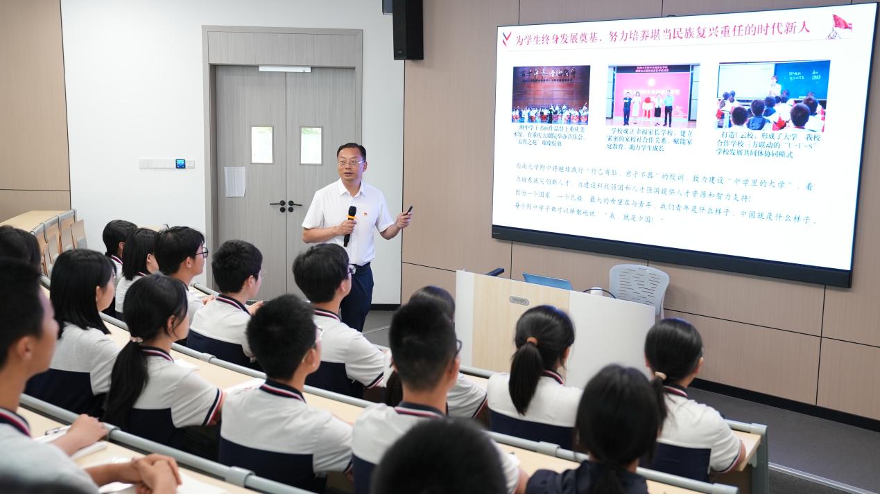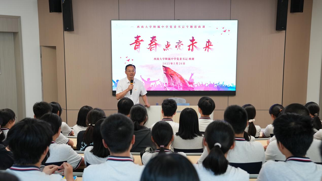 铸魂育人担使命,培根固本启新程。为深入贯彻落实新时代学校思政课建设推进会精神,引导同学们将社会主义核心价值观内化于心、外化于行,助力莘莘学子锚定远大理想目标,坚定信念、勇毅前行。2024年5月26日下午,PA视讯附属中学逸夫楼一楼阶梯教室内座无虚席,一场以“青春与使命”为主题的专题思政课在此隆重举行。PA视讯附属中学党委书记欧健以《青春点亮未来》为主题,为全校非毕业年级学生干部开设一堂立意高远、内涵深刻的思政课。